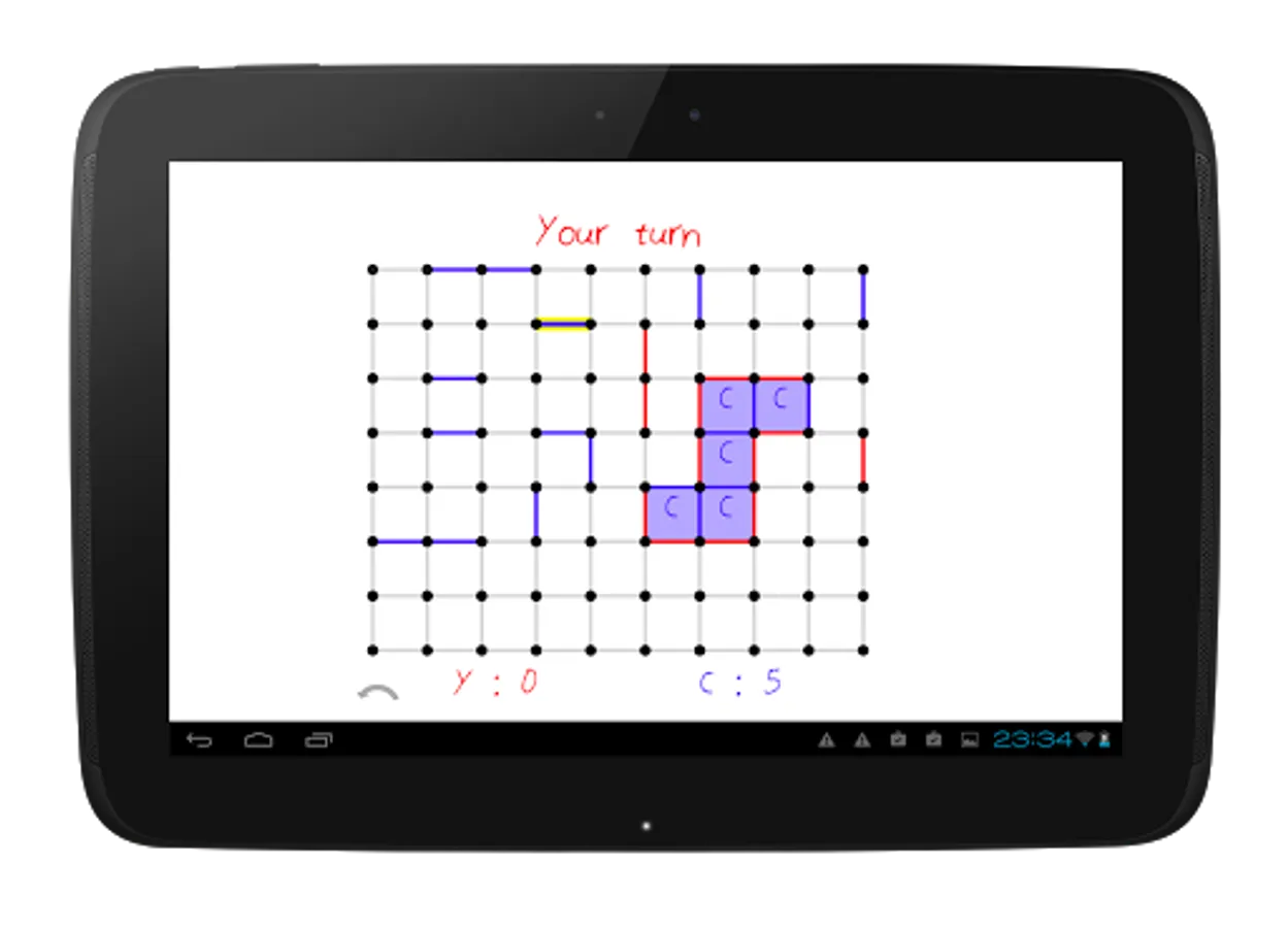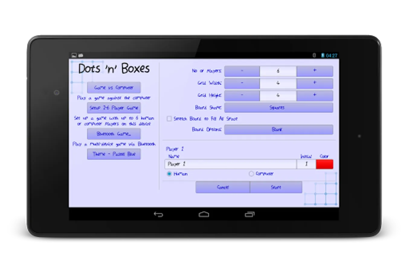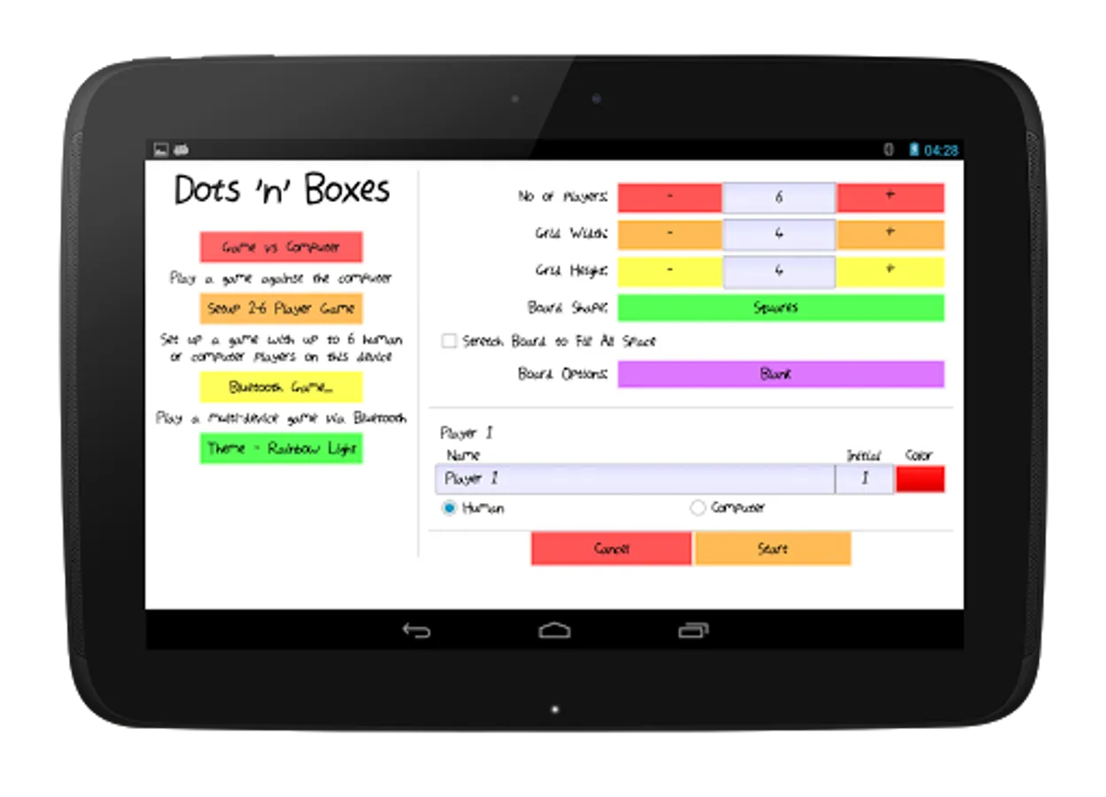 Play Dots and Boxes Against the Computer, Multiplayer on the Device, or Multiplayer via Bluetooth!