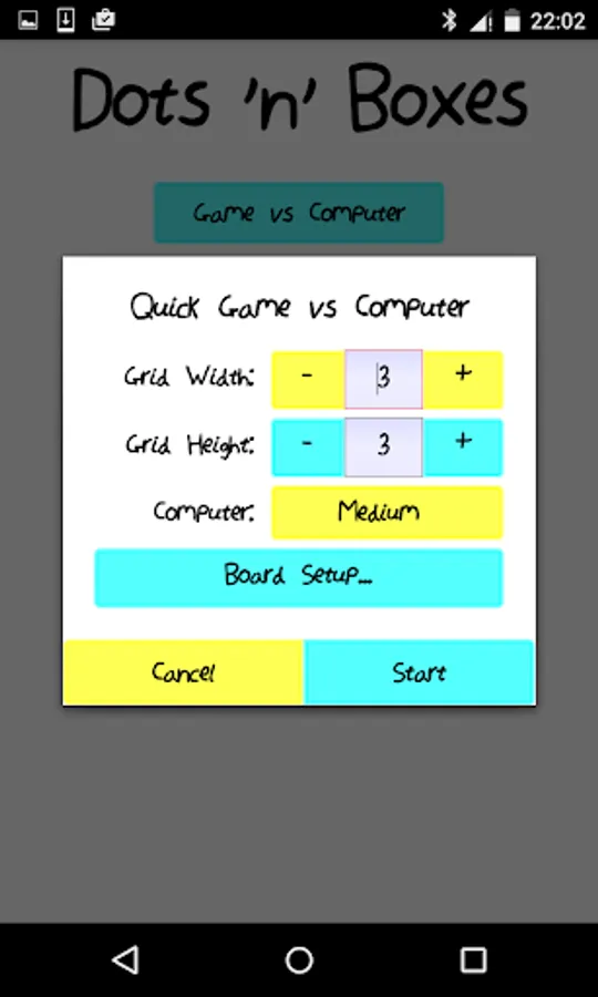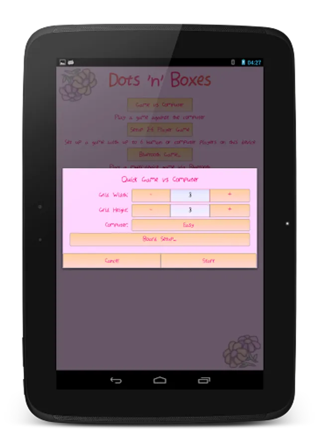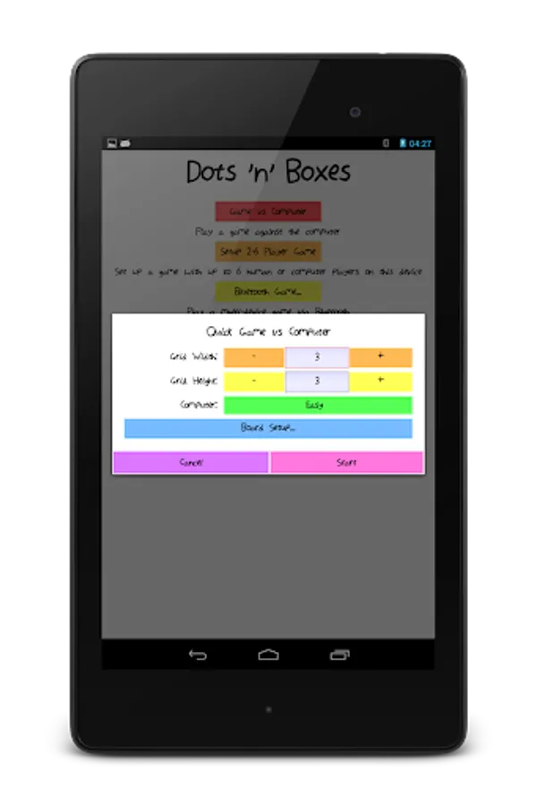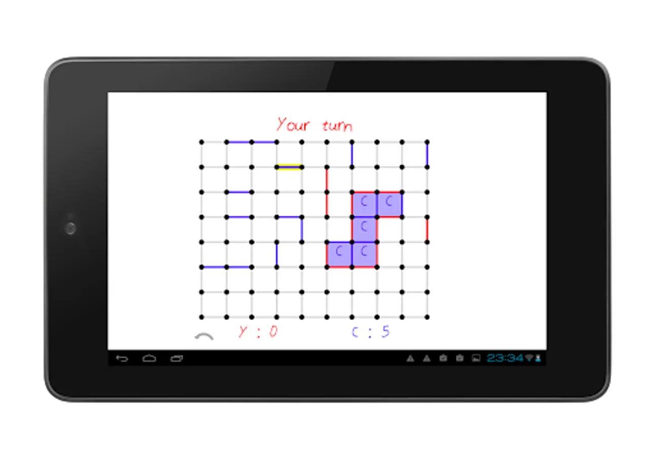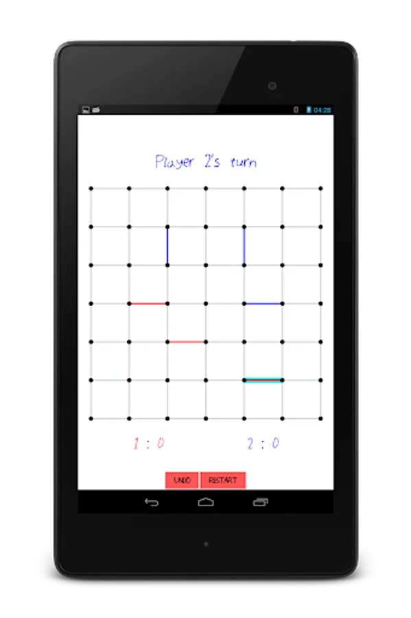 Play Dots and Boxes Against the Computer, Multiplayer on the Device, or Multiplayer via Bluetooth!
