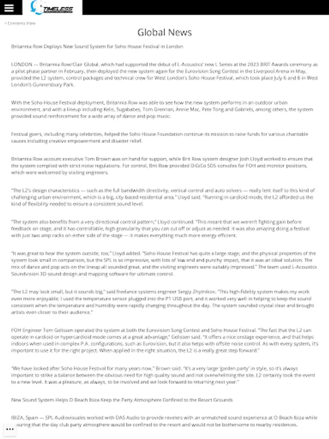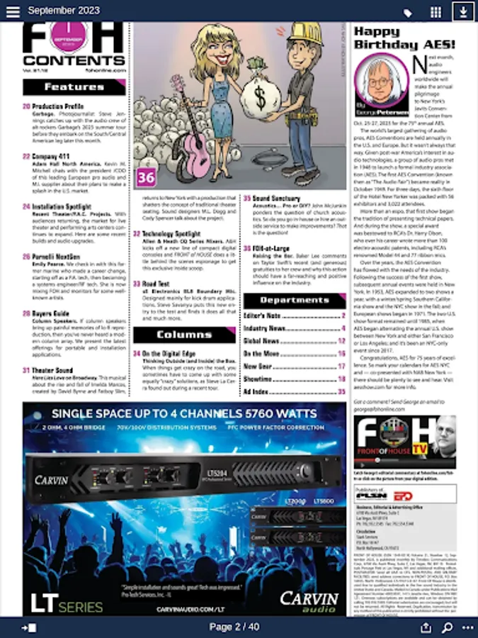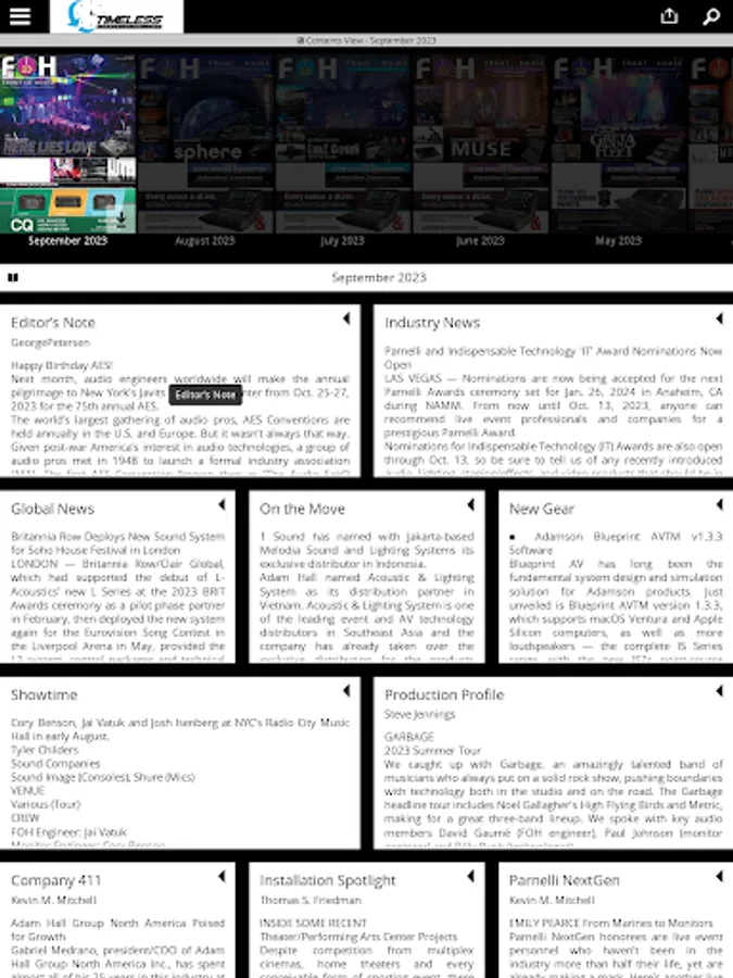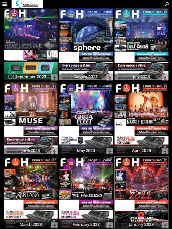 FRONT of HOUSE is the leading source and record of news for the live sound community, covering concerts, tours, installations, houses of worship and entertainment technology for the industry. We provide coverage of the latest news, products and commentary each month. Inside you will find news about the industry from around the world, product news, product reviews, opinions and ideas to advance the industry. Each month you can easily download the latest or past editions of the magazine all right within the application.