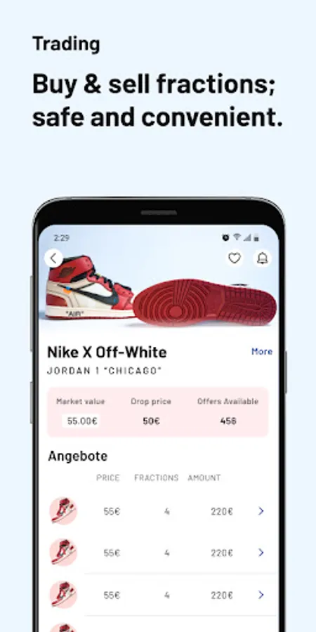 Our newly introduced limit orders make trading a breeze. Simply specify the number of fractions you would like to buy and your price limit, and we will make the purchase as soon as a matching offer is available. This way, you'll never miss out on a good deal again.