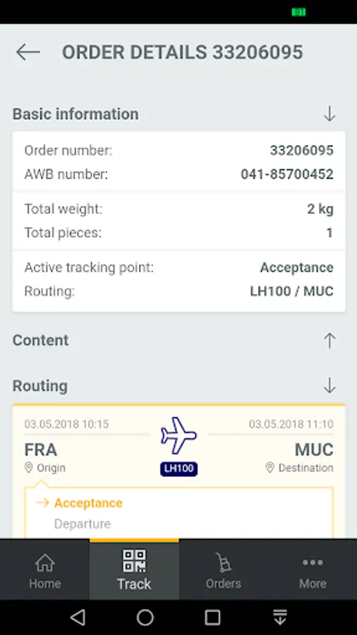 Conveniently check the shipments details (reference, pieces, weights) and proceed to the tracking information.