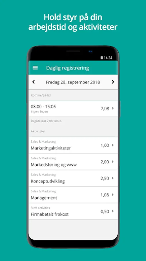 It is possible to record your day daily with your chosen activities. These activities can be added, edited and deleted unless the day is locked. In addition, you can record your come / go time, thereby telling the system when your work day started and ended.