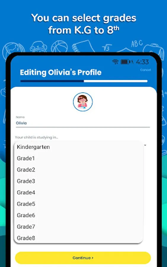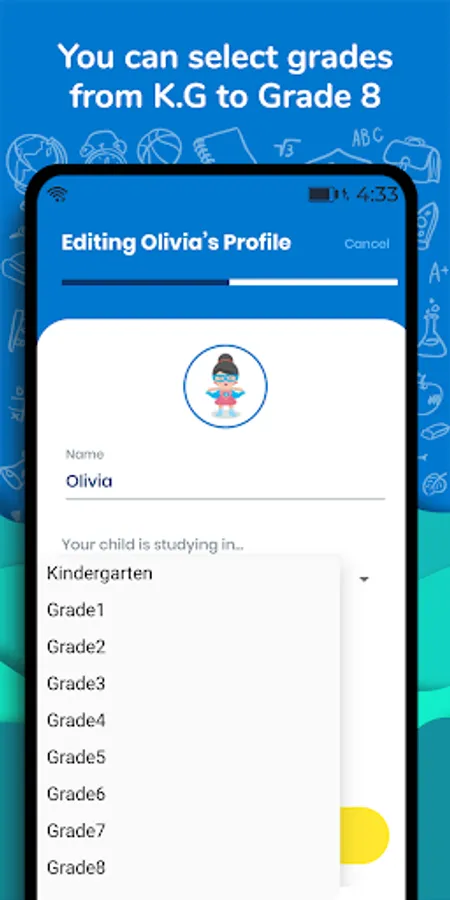 • Set the Grade level for your child anywhere from Kindergarten to Grade 8 (Ages 3 to 11).
