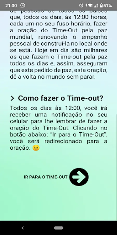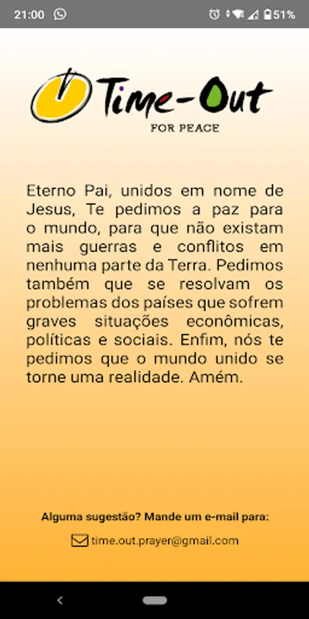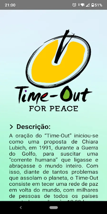 The “Time-Out” prayer began as a proposal by Chiara Lubich, in 1991, during the Gulf War, to create a “human chain” that would connect and embrace the whole world. With this, in the face of so many problems that plague the planet, Time-Out consists of weaving a network of peace around the world, with thousands of people from all countries who, every day, at 12:00 pm, each one in your time zone, say the Time-Out prayer for world peace, renewing your personal commitment to building it where you are. Nowadays there are thousands who make the Time-out for peace every day and, thus, ensure that this request for peace, this prayer, goes around the world without stopping.