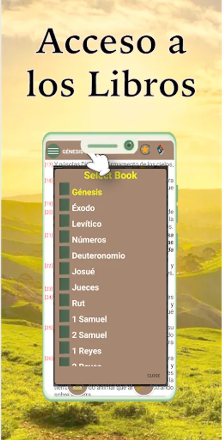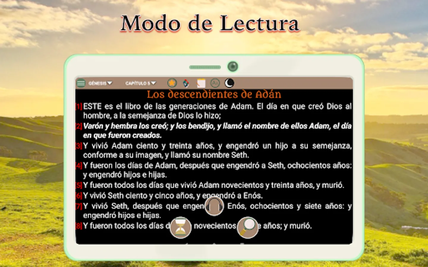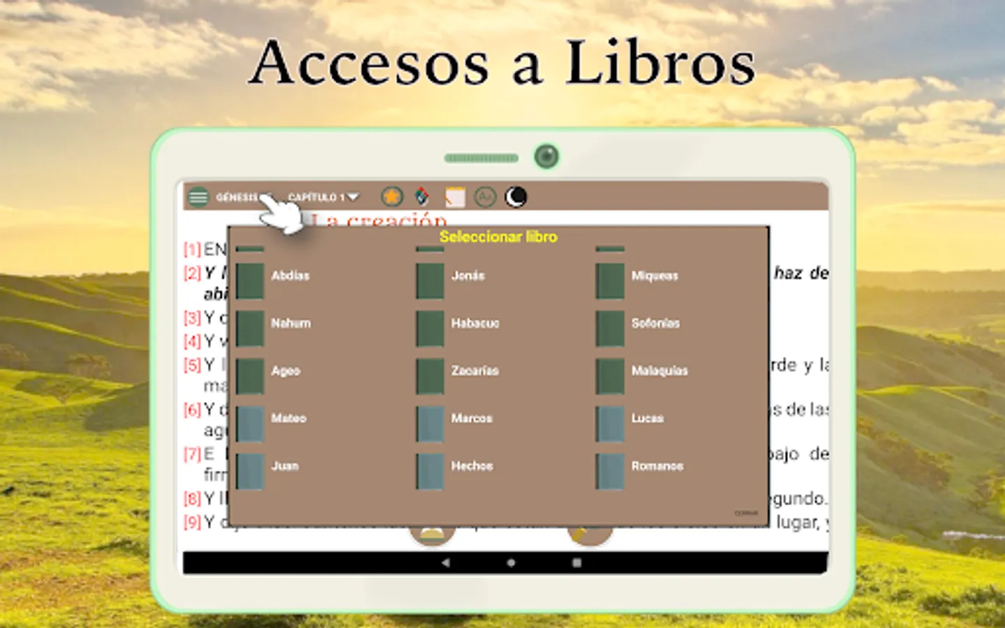 Usted puede hacer clic en la pantalla y la en la parte inferior aparecerá el nombre de libro y el capítulo, al presionarla aparecerá el listado de los libros y en la otra los capítulos que posee el libro seleccionado.