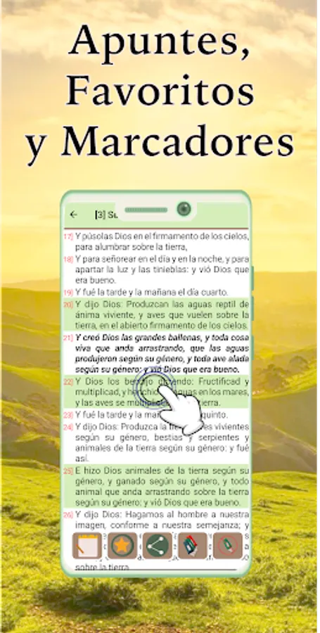 Puede seleccionar uno o varios versículos de un capitulo y marcar como favorito tambien puedes compartir con tus amigos los versículos en las diferentes redes sociales.
