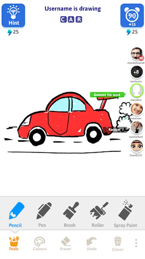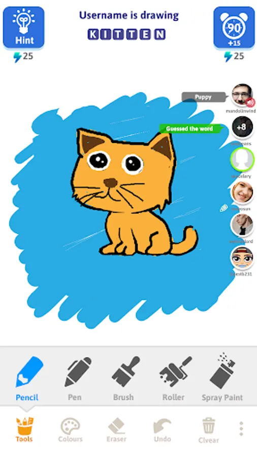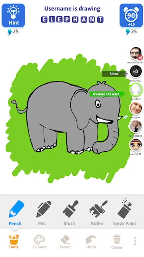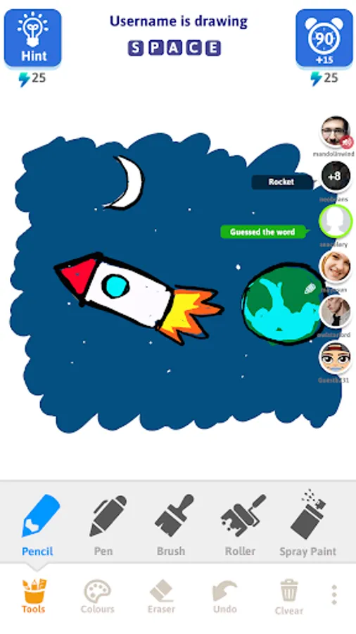 The fun begins here! If it’s your turn to draw, start drawing pretty pictures for the given word. If it’s your turn to guess, start making funny guesses. Beware!!! To win a round, you need to be the first one to guess the word. So hold on tight and start making guesses!