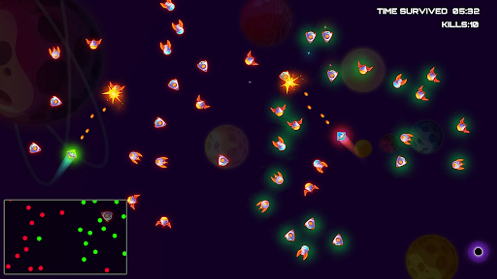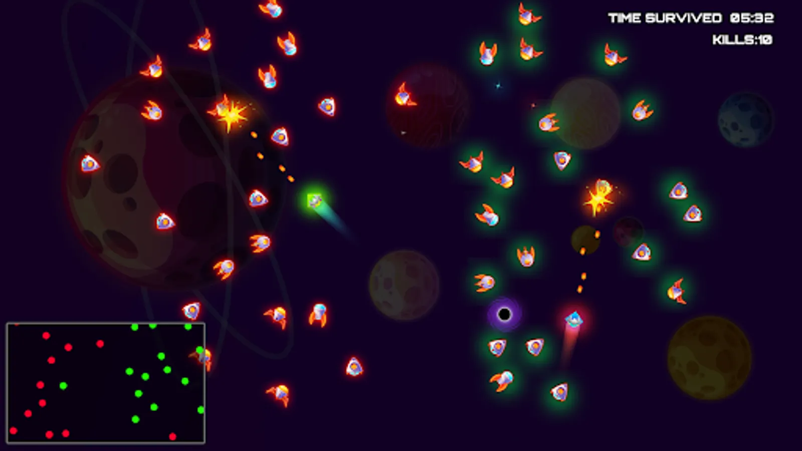 • Space survival multiplayer: Players must navigate in a hostile universe and fight off other spacelings in order to survive. Compete with friends by creating longer surviving time and high kills.