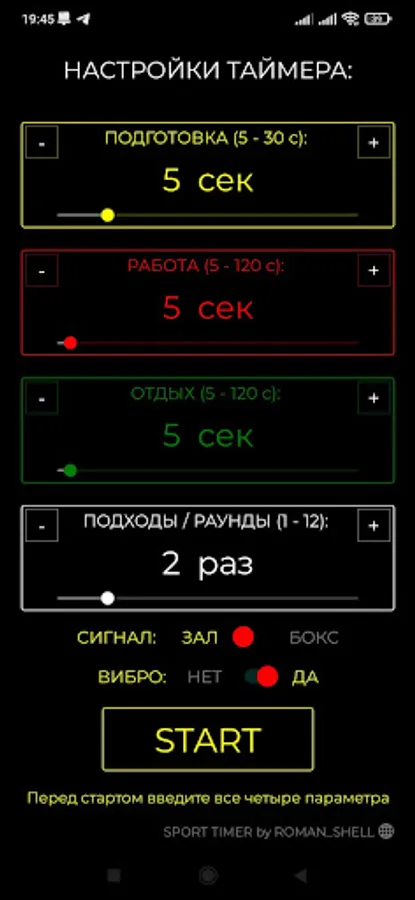 The timer can be used to control the time of approaches, rounds, a break between them. You can set the sound signal as a beep or gong in the box. Vibration or not. Color indication of the current period.
