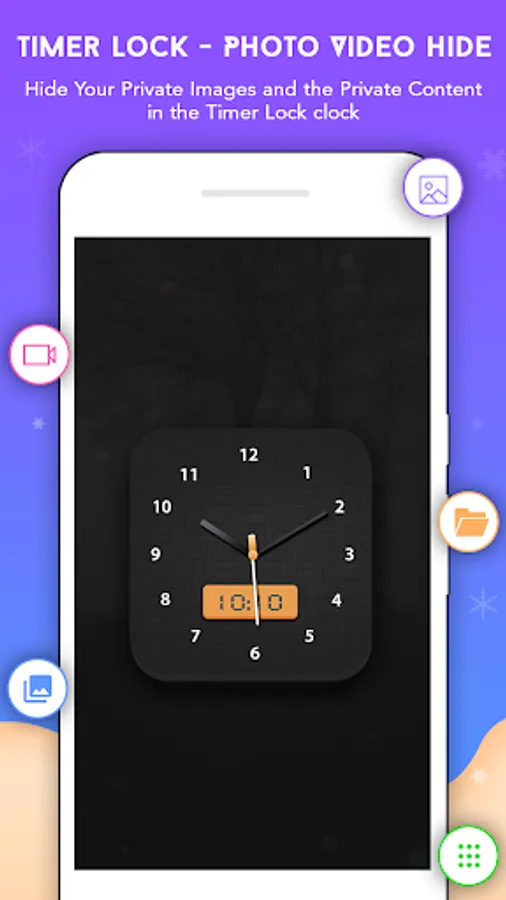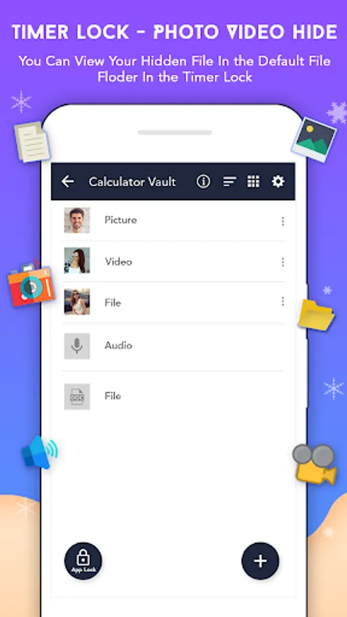Use this Timer vault to hide pictures, hide photos, hide videos and use app lock secretly inside app.