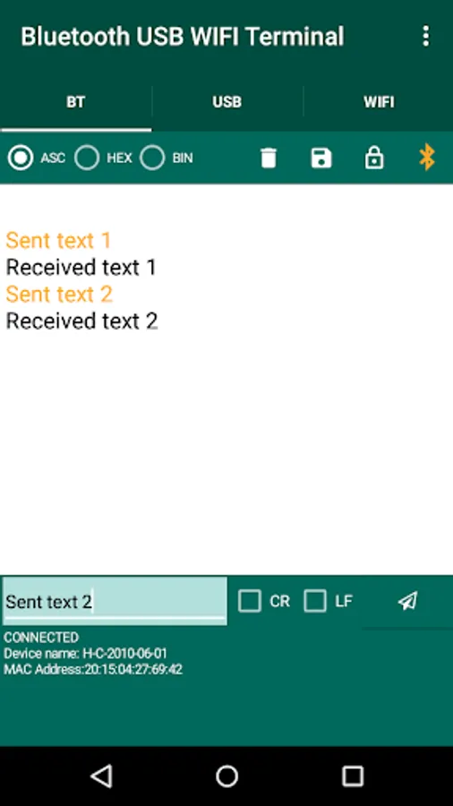 Bluetooth USB WIFI Terminal is a terminal application for connecting to Bluetooth using Serial port profile (SPP), USB serial devices using USB OTG(On the Go) and WIFI TCP connections.
