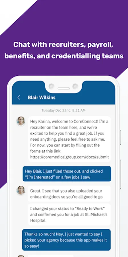 In-app chat makes it easy to stay in touch with your personalized team. Keep track of your current placements with CoreMedical Group directly in the app.