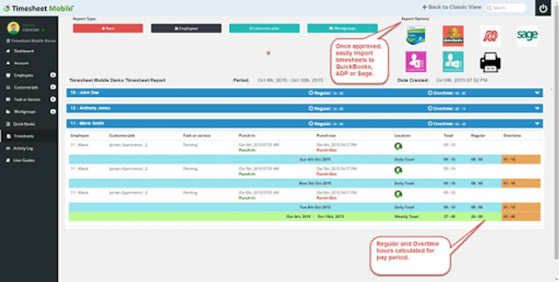 • Easily Edit, delete, or approve timesheets from the app or admin console