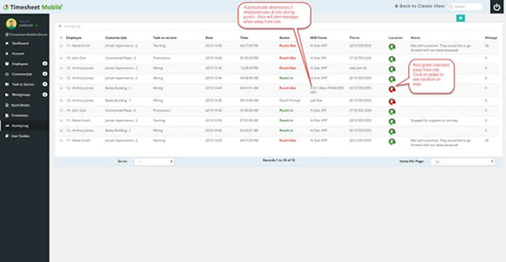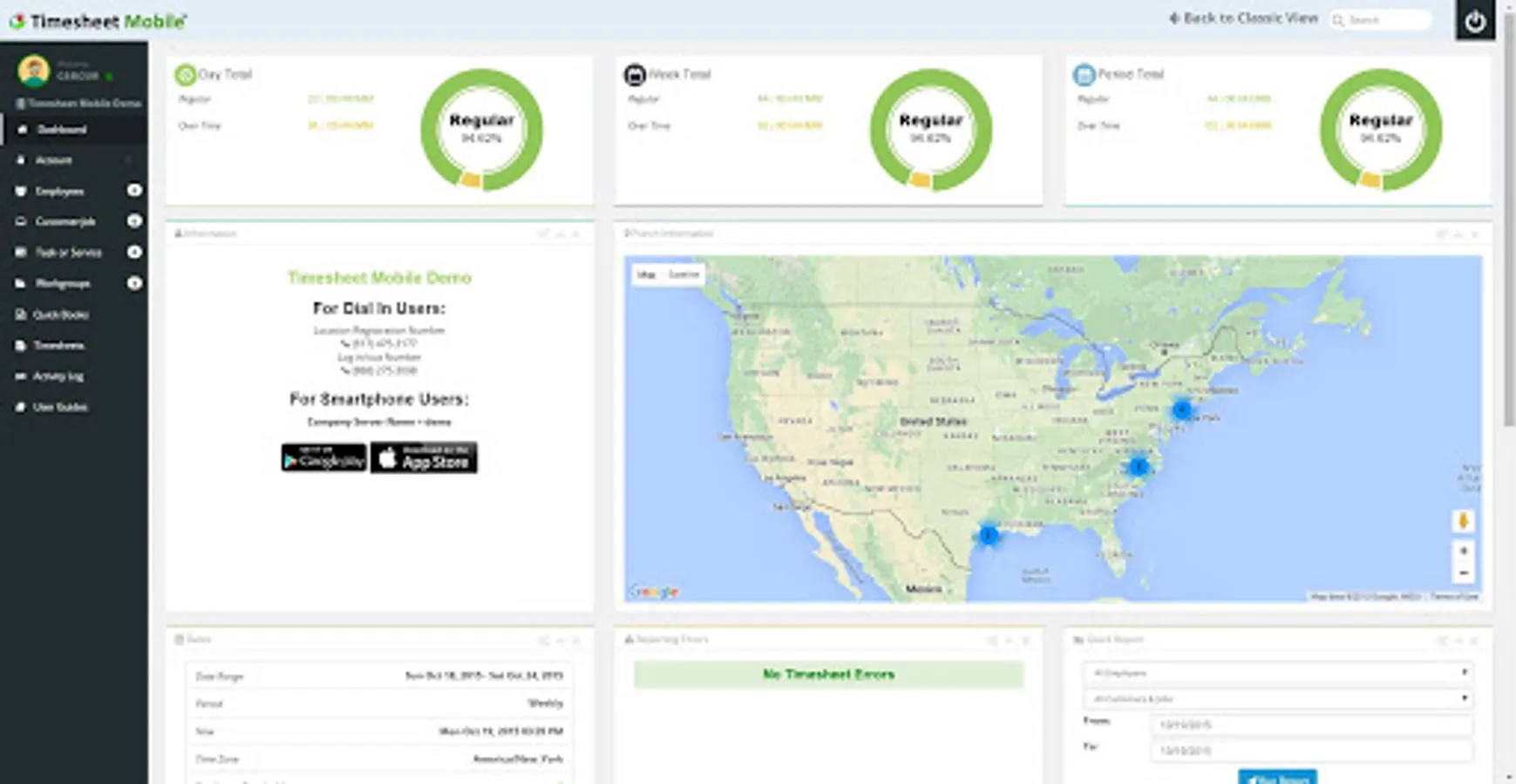 Tracks employee work times and locations and reminds them to punch in/out when they enter and exit a geofenced jobsite. Timesheet Mobile is very easy to use and automates your entire timekeeping process from employee logs to Quickbooks import. In addition to ensuring accurate employee timekeeping, the time clock application provides employee GPS location verification and saves your company many administrative hours per month. The Timesheet Mobile solution includes smartphone punch in/out, GPS and mapping features, and real-time syncing and reporting to your secure Employer Web Portal.