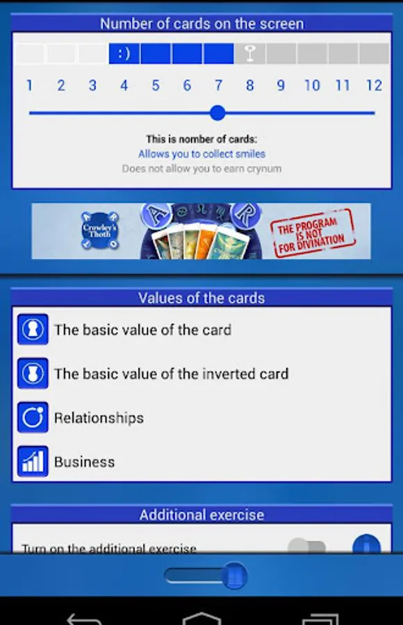 The value of this deck in the diversity of the characters that added in the image by Crowley. It is the symbolism of Tarot cards Thoth allows their use in a wide range of esoteric practices. In order for your intuitive search has not turned into wandering from one association to another, you need to have a precise representation about the basic values of each card in a particular position. This is a great amount of knowledge, which is difficult to remember and to keep in mind. To simplify the memorization of values and make this process dynamic use my trainer.