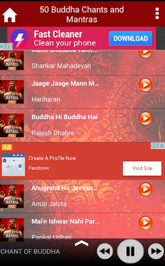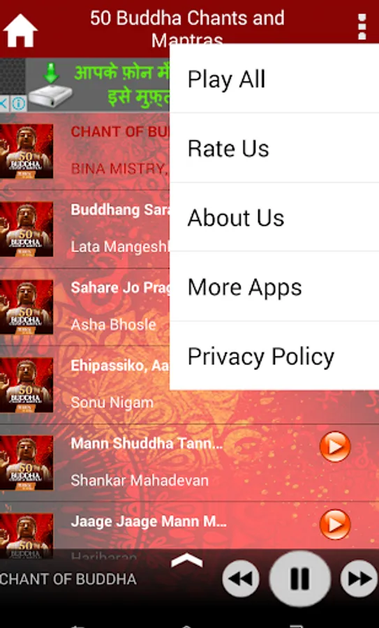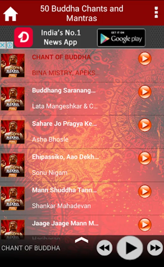 Download the app 50 Buddha Chants & Mantras free recited by various artists like Lata Mangeshkar, Asha Bhosle, Sonu Nigam, Shankar Mahadevan, Hariharan, Anup Jalota, Pankaj Udhas, Suresh Wadkar, Shaan, Craig Pruess, Vijay Prakash and many more.