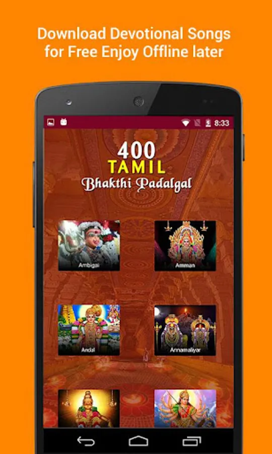 Simply download this one app and get a collection of Tamil Bhakti songs. Devotional Songs in Tamil on Lord Amman, Lord Ayyappan, Lord Shiva, Lord Murugan, Lord Krishna, Shirdi Sai Baba, Lord Karuppasamy, and other Deities from the South. The app features songs by various legendary artists including Unni Menon, Bombay Sharadha, Mambalam Sisters, S P.Balasubramaniyam, Vani Jayaram and many more. So download this app now and enjoy the soulful collection of devotional songs in Tamil.