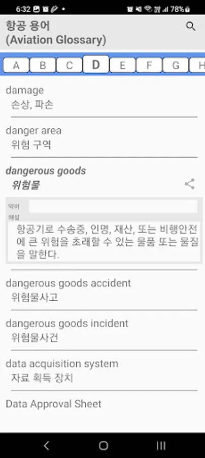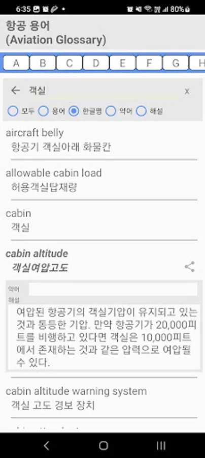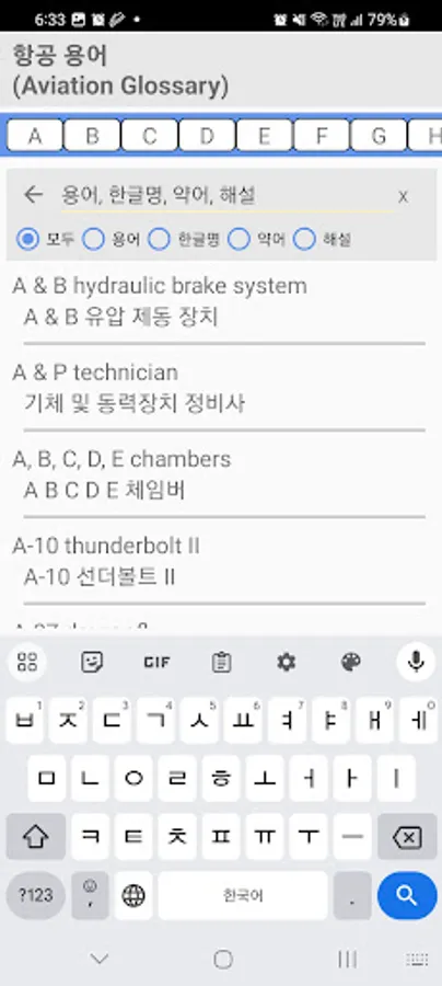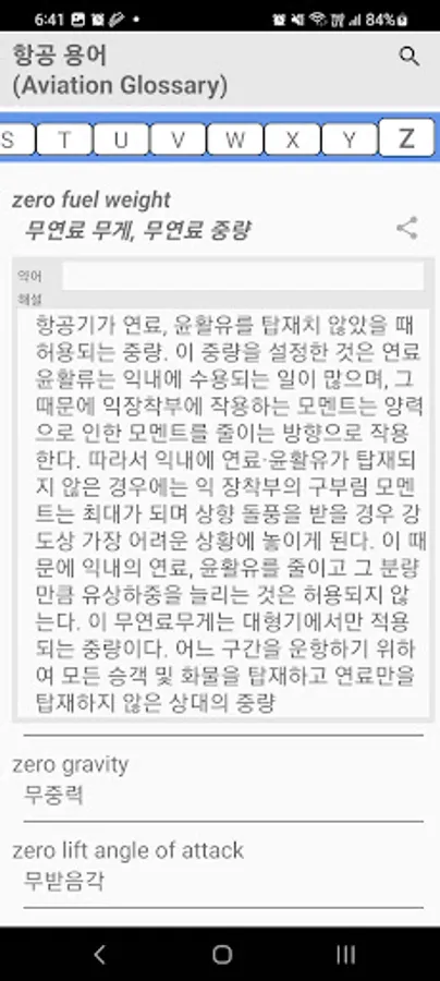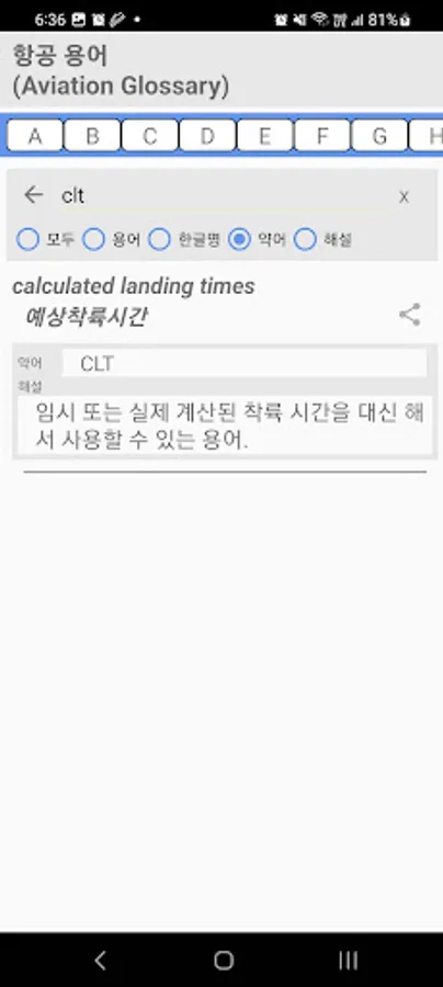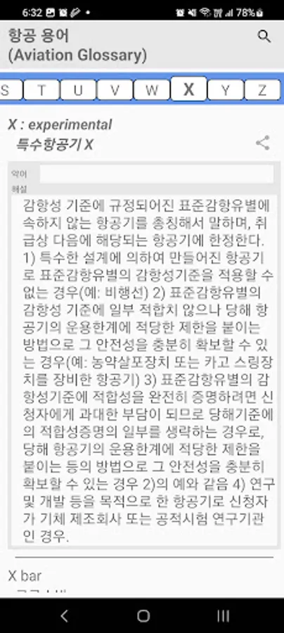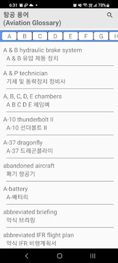 Provides information on technical terminology used in the aviation field, including English and Korean terms, abbreviations, and detailed explanations of terms.
