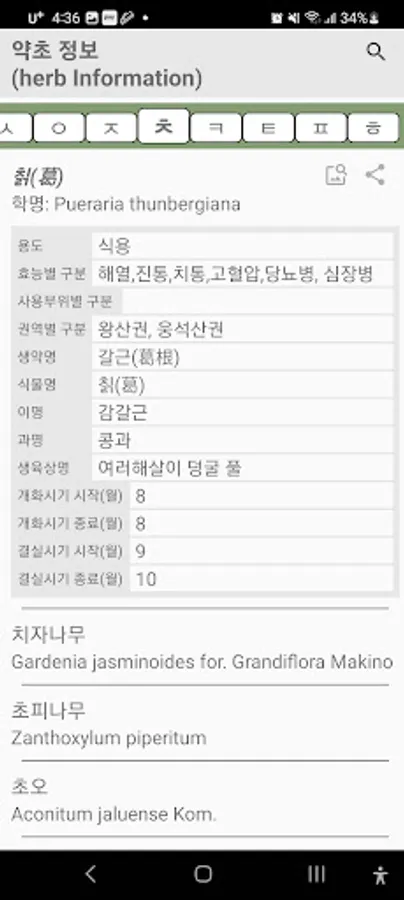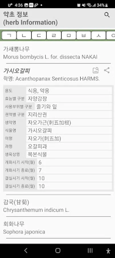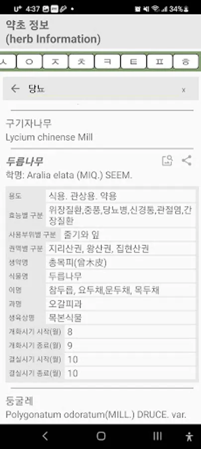Provided list: Herb name, region, efficacy, part of use, herbal medicine name, scientific name, family name, growth phase name, fruiting period, use, etc.
