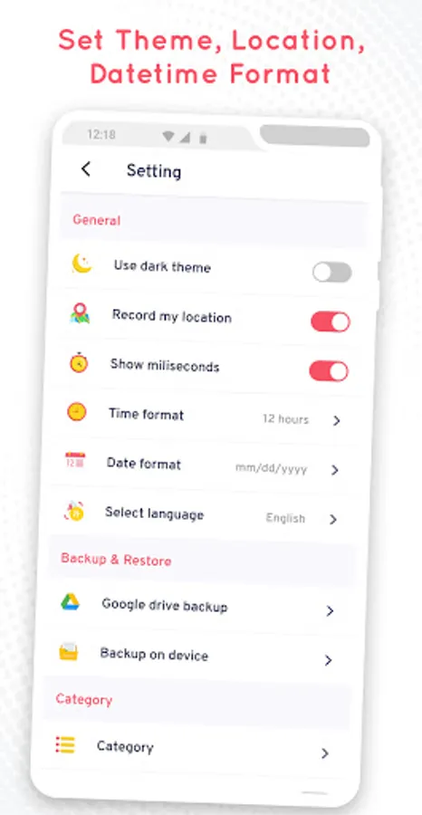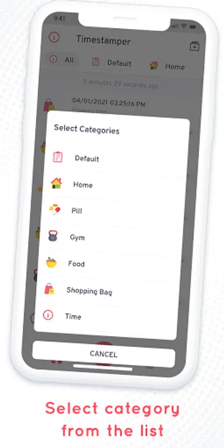 • Available categories: All, Default, Baby, Book, Food, Gym, Home, Pill, Travel, Cap, Car, Flame, Flowers, Gift, Heart, Hospital, Map, Money, Movie, Music, Night, Pet, Phone, Pizza, Shopping Bag, Sport, Stop Watch, Train, Water, Weather