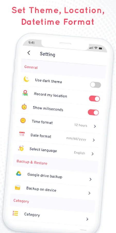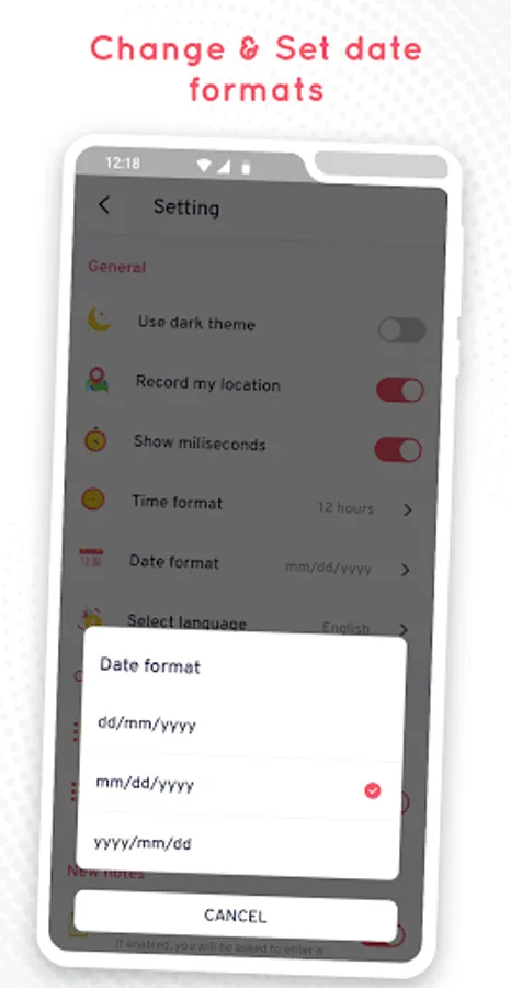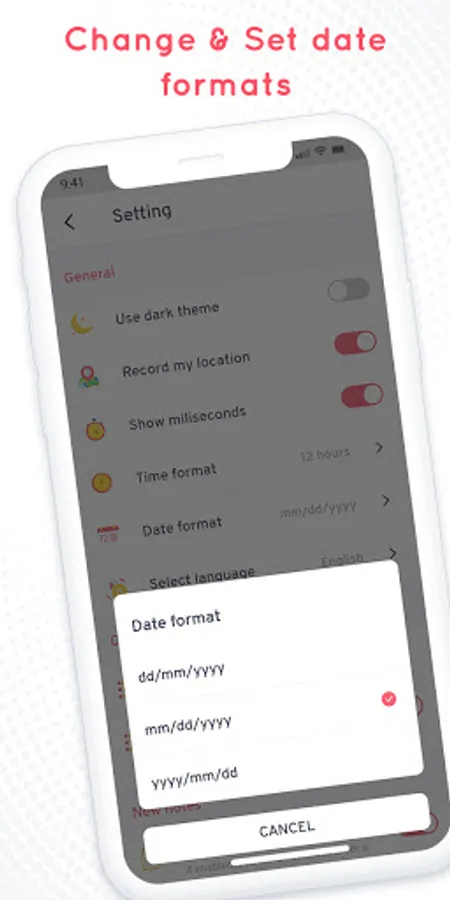 • On/Off toggle available to Set theme, Location, or to show milliseconds