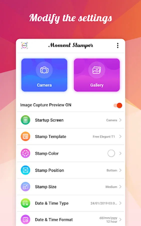 ON/OFF toggle to add #MomentStamp tag on the Gallery Photos or on image that captured with this date camera!
