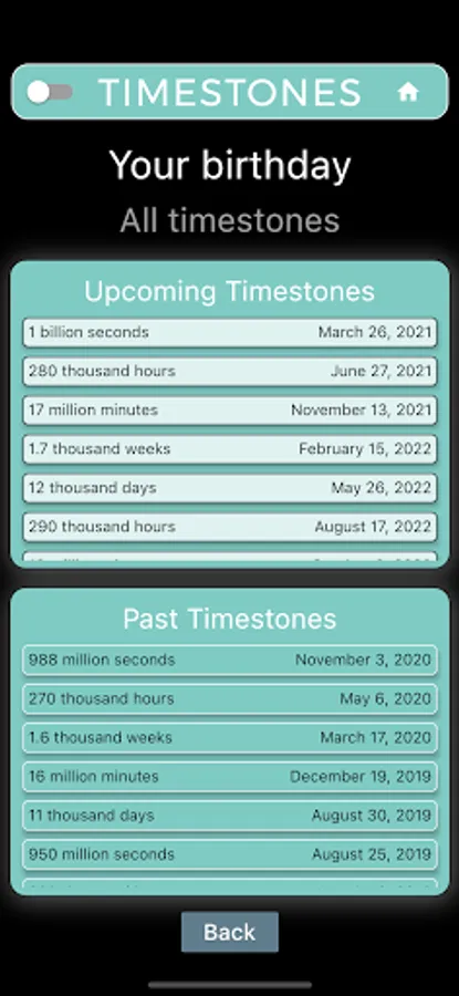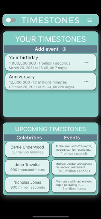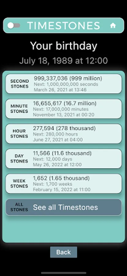 Timestones are special moments that pass, often without us even knowing. When do you turn 1 billion seconds old? Maybe you made a new friend 1 million minutes ago, or graduated 10,000 days ago, or got married 100 weeks ago. Whatever the event, now you will know when your timestones are coming. You can also see when celebrities or historical events reach timestones in the Timestones app.