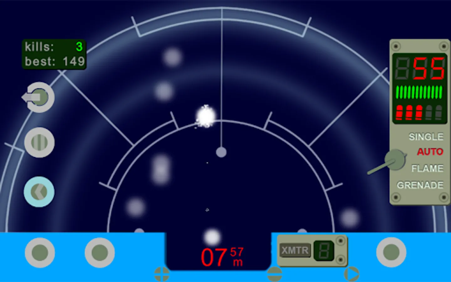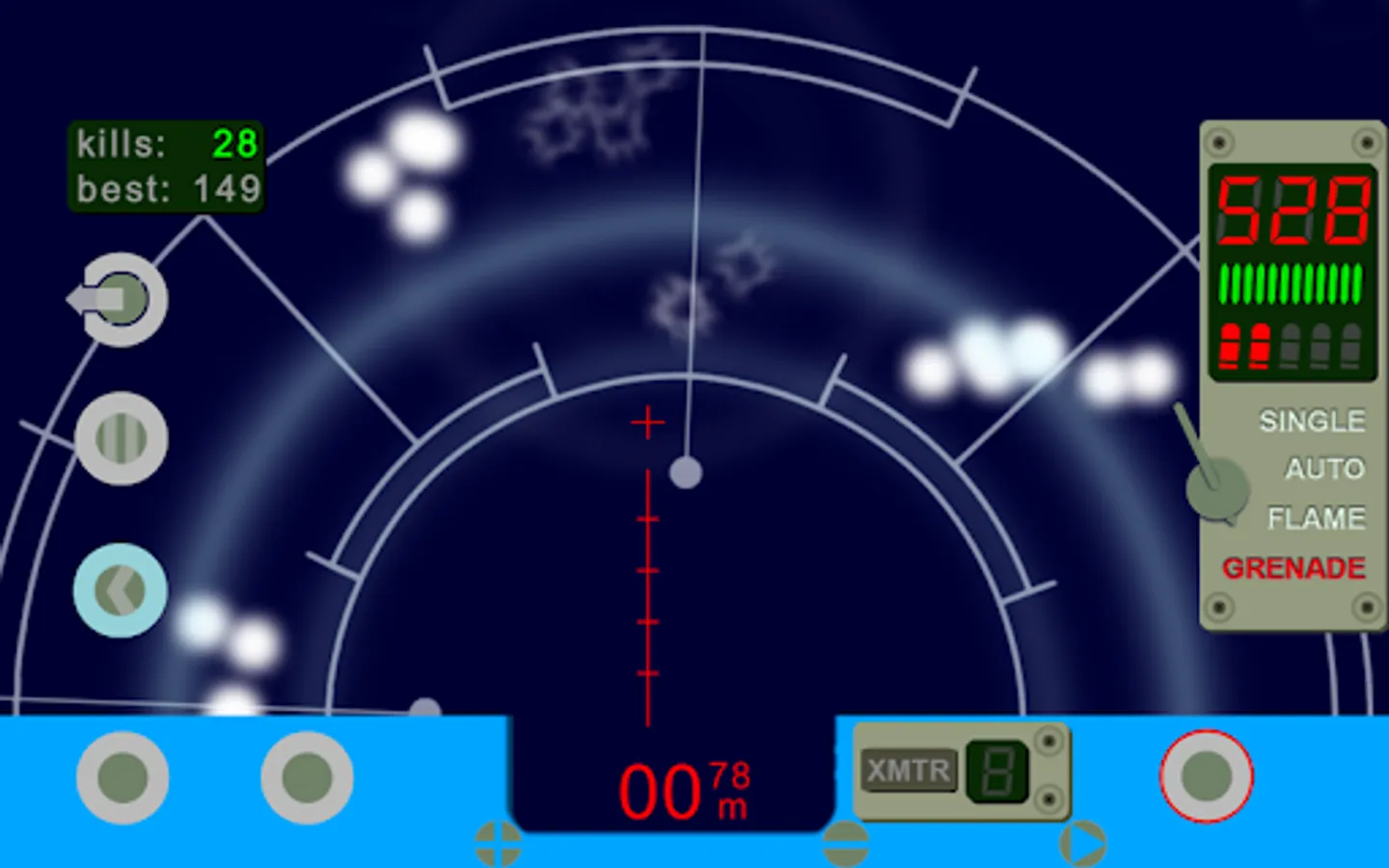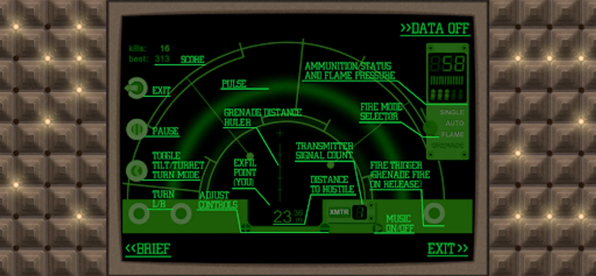 Motion tracker device simulation - with a twist. Along with motion of aliens, this motion tracker detects projectile trajectories, hits on target, transmitters from the colonists, and sudden changes in temperature. Luckily, it has button linked to trigger on your pulse rifle, so you can use it to aim and shoot. Also, there is a fire selector switch to choose between single, auto, flame, or grenade fire modes. You can tilt your device to turn and aim, or choose turret mode to access on screen turn controls.