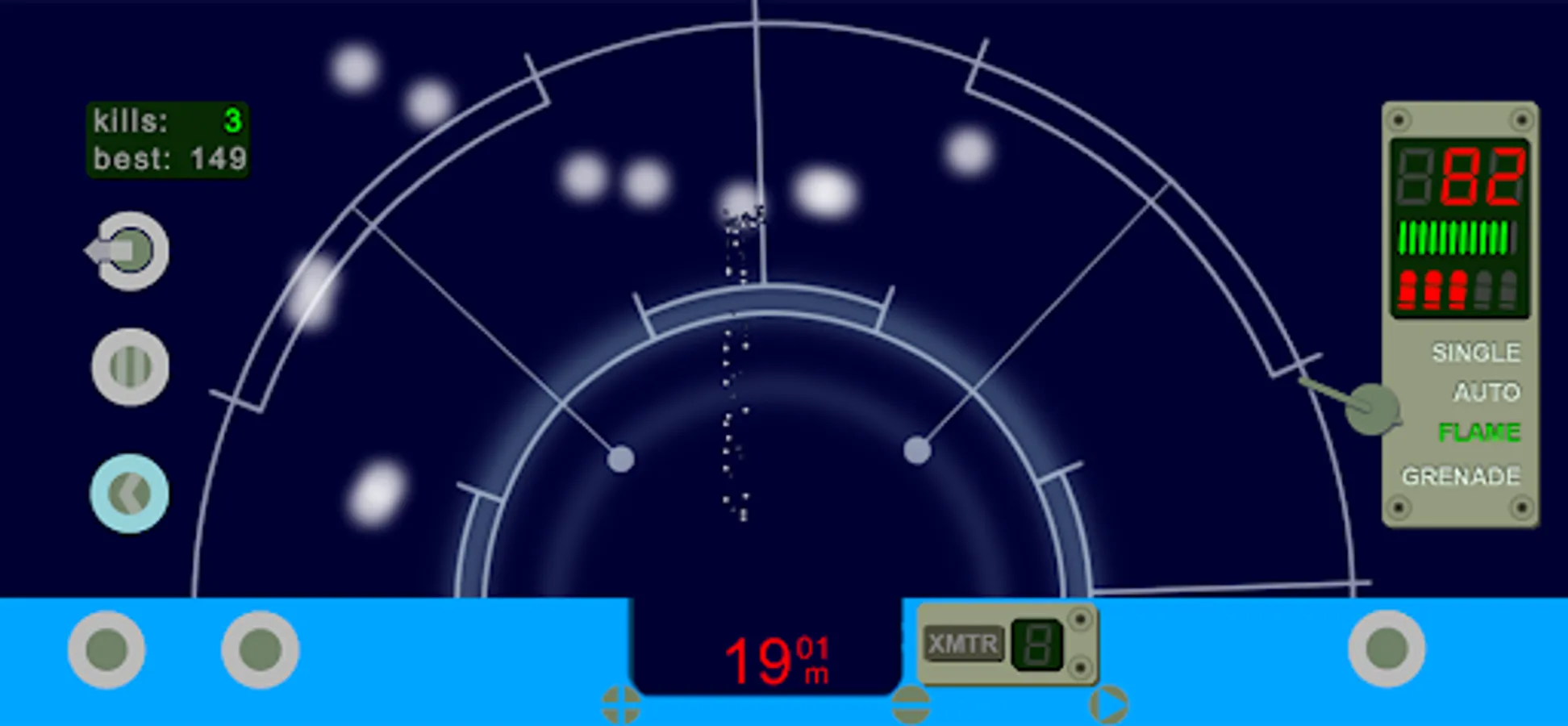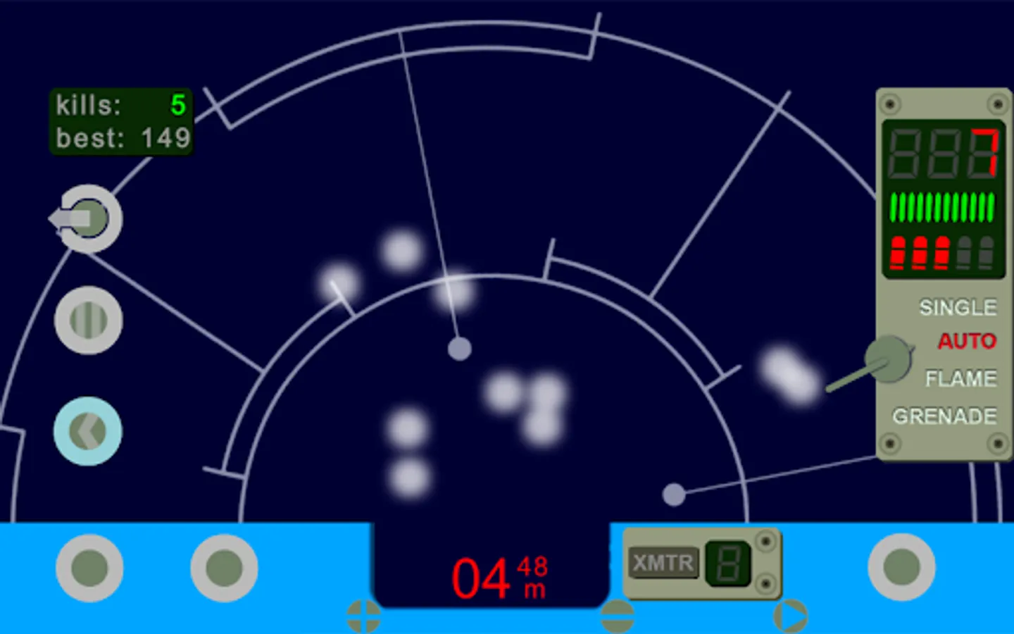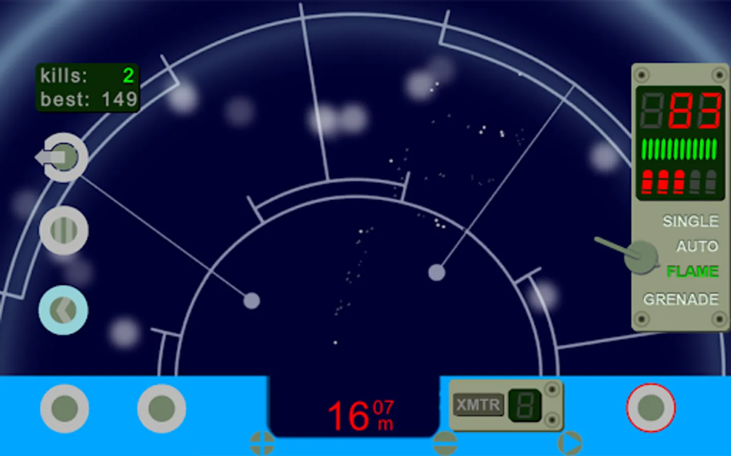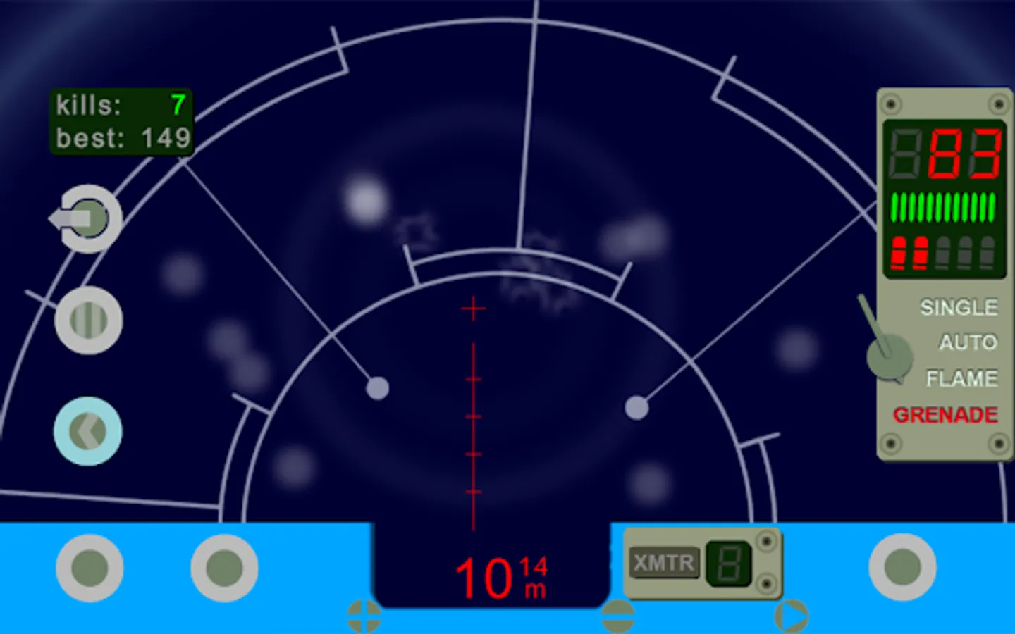 Motion tracker device simulation - with a twist. Along with motion of aliens, this motion tracker detects projectile trajectories, hits on target, transmitters from the colonists, and sudden changes in temperature. Luckily, it has button linked to trigger on your pulse rifle, so you can use it to aim and shoot. Also, there is a fire selector switch to choose between single, auto, flame, or grenade fire modes. You can tilt your device to turn and aim, or choose turret mode to access on screen turn controls.