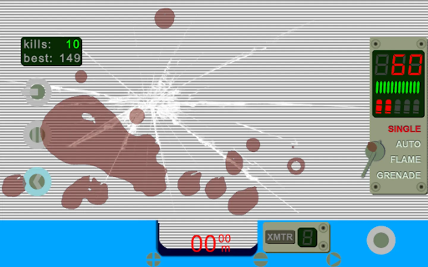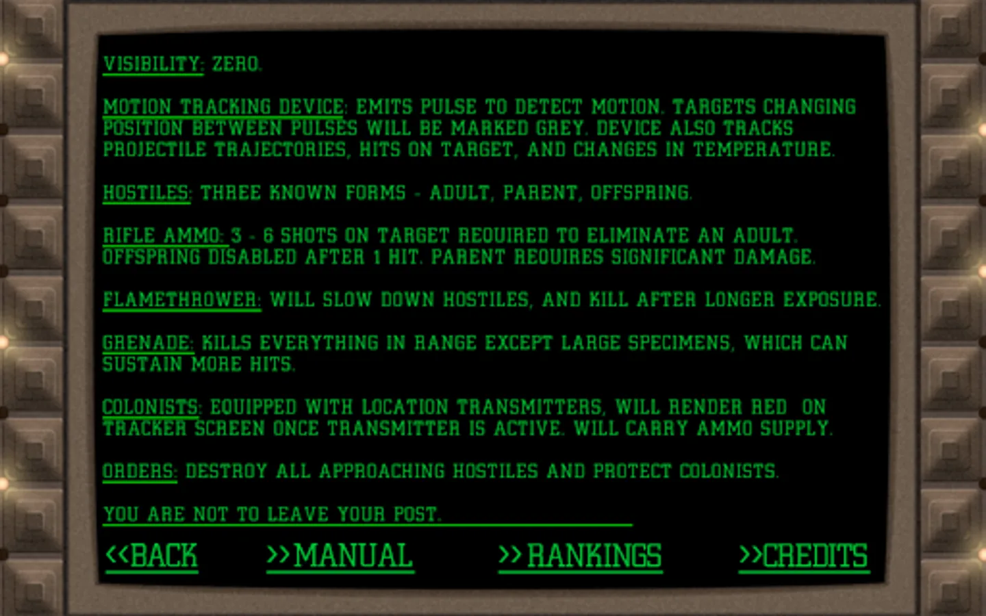 Your assignment is to protect exfil (exfiltration) point for civilian retreat. Visibility is zero, so you will have to use device assisted aiming and shooting. Your goal is to defer all approaching alien hostiles and spare friendly targets. In return, every colonist you save will give you personal ammunition supply.