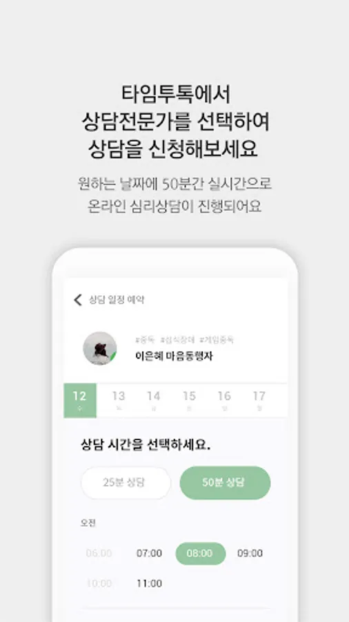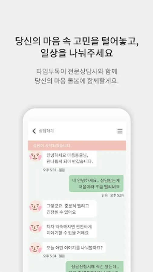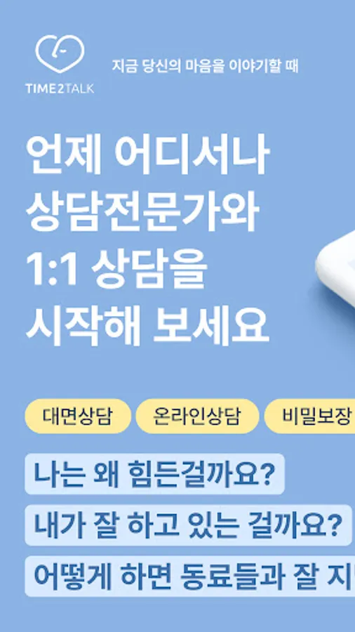 Time to Talk (TIME2TALK) allows you to receive psychological counseling from a counselor anytime, anywhere through mobile.