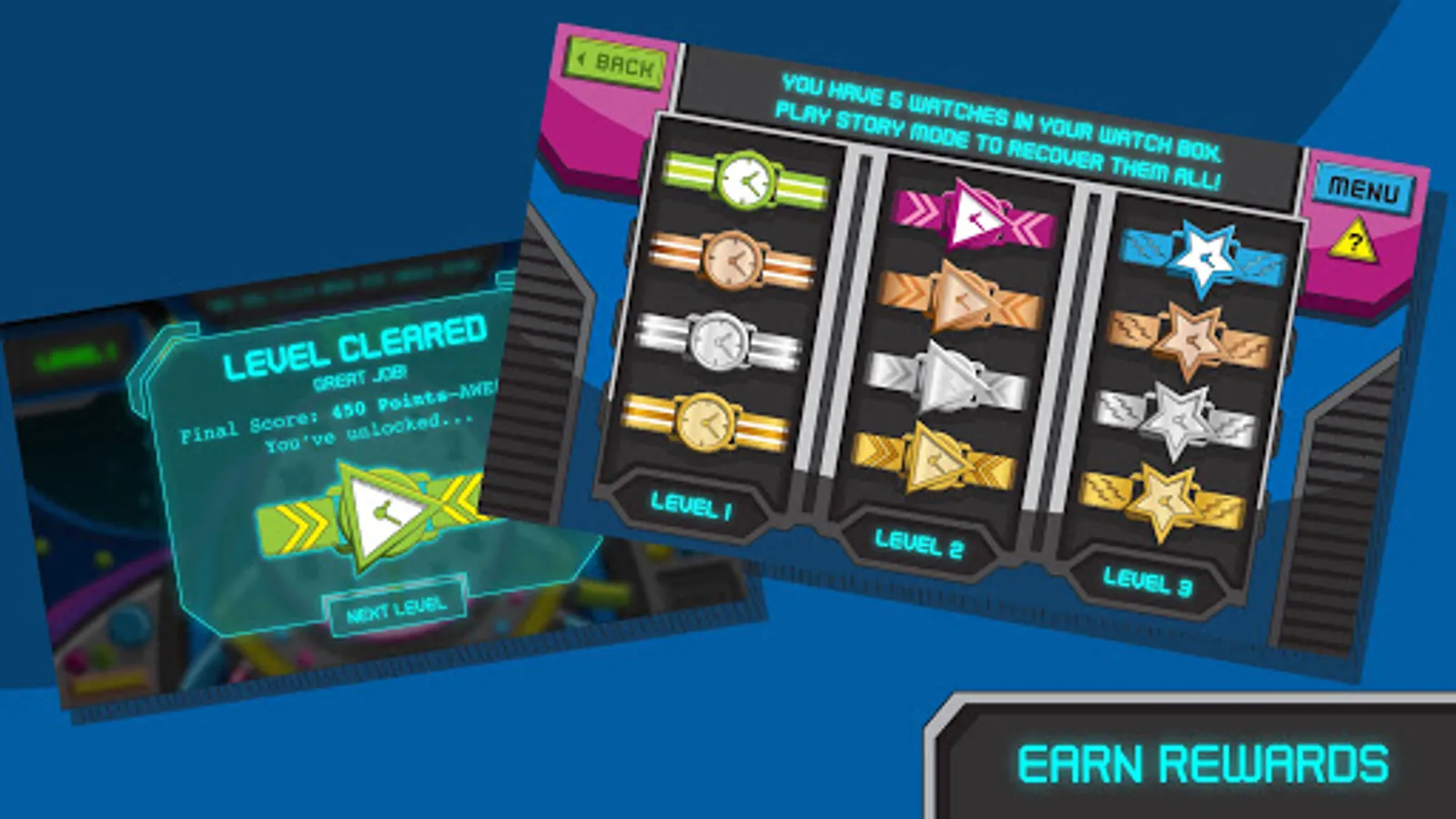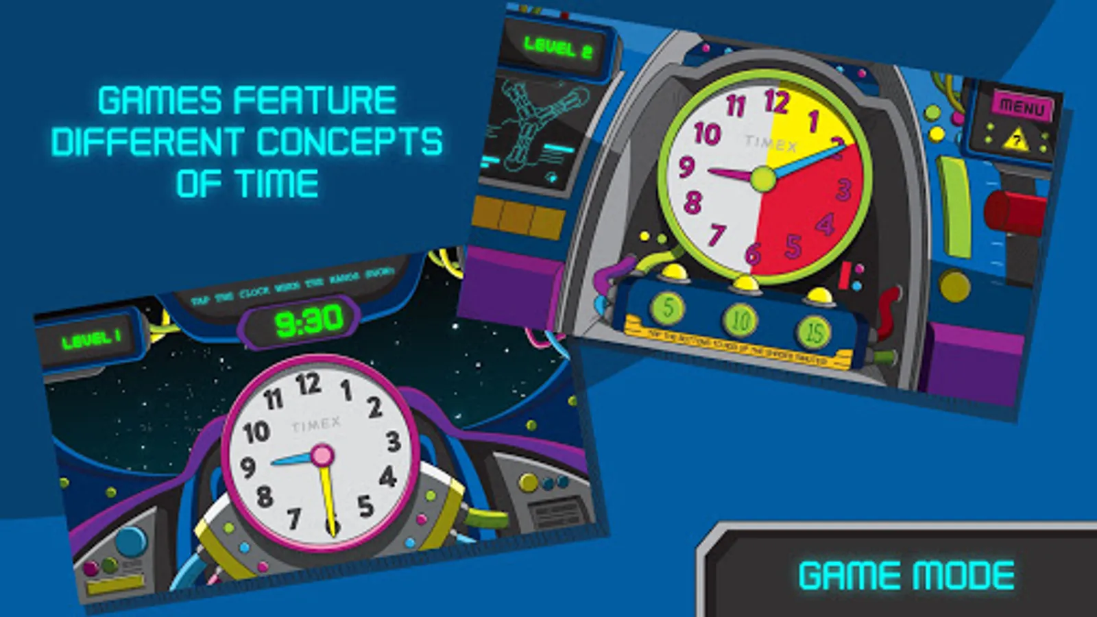 Game Mode LEVEL 3: Rocket Time - Time, in the form of clock faces, is falling from the top of the screen toward the player’s Time Machine. The player must tap the clock that matches the written time shown at the bottom of their screen.