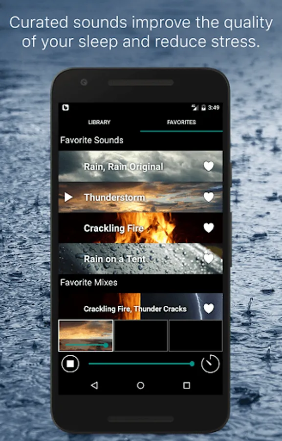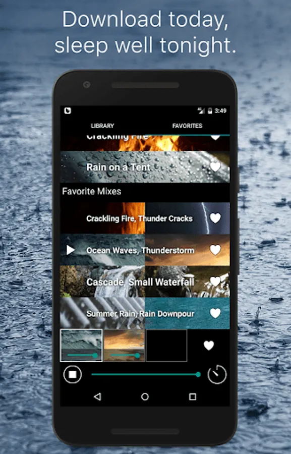 Trouble sleeping? Rain Rain® Sleep Sounds helps you fall asleep fast! Let dozens of high-quality endless sounds lull you to sleep in no time. Heavy rain, light rain, rain on a tin roof - not to mention a huge variety of non-rain sounds, too, like ocean waves, crackling fireplace, cat purring, Shih Tzu Snoring, washing machine, clothes dryer... even a ticking clock! Includes any sound for sleeping that you can think of, and some that you can't. Millions of people have found the sleep they have been looking for with Rain Rain and you can too.