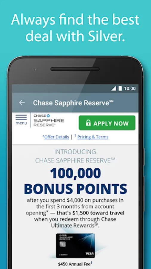 Silver Credit is a free app that lets you compare all the best credit card offers from national banks (American Express, Chase, Citibank, Discover, Capital One, Bank of America, Barclaycard, ...) and apply, in just a few taps.