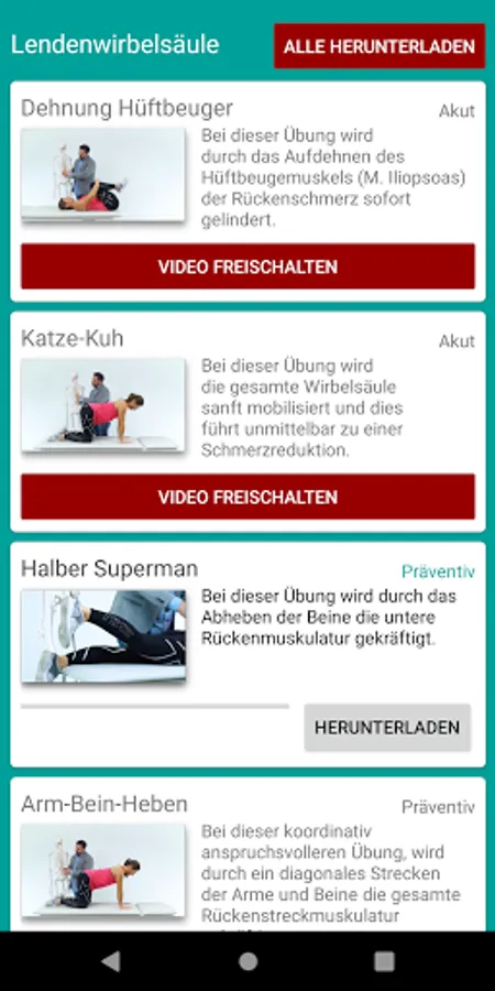 The typical pain points on the back can usually be worked on very well with simple exercises. In this app there are videos to alleviate the acute pain condition as well as exercises that can prevent the recurrence of back pain. The app cannot and should not replace a visit to the doctor or therapist, but rather provide good instructions for simple, gymnastic exercises at home.