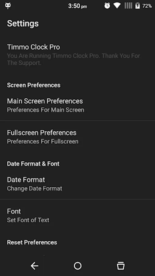 You can access the stopwatch, fullscreen, fullscreen night mode by swiping right on the main screen or tapping or long pressing anywhere. Swiping left shows some quick shortcuts (Depending if you have them enabled). Swiping again on either side will hide the icons. Icons will disappear after a certain time. Via the menu, you can access preferences to personalise the application as you like.