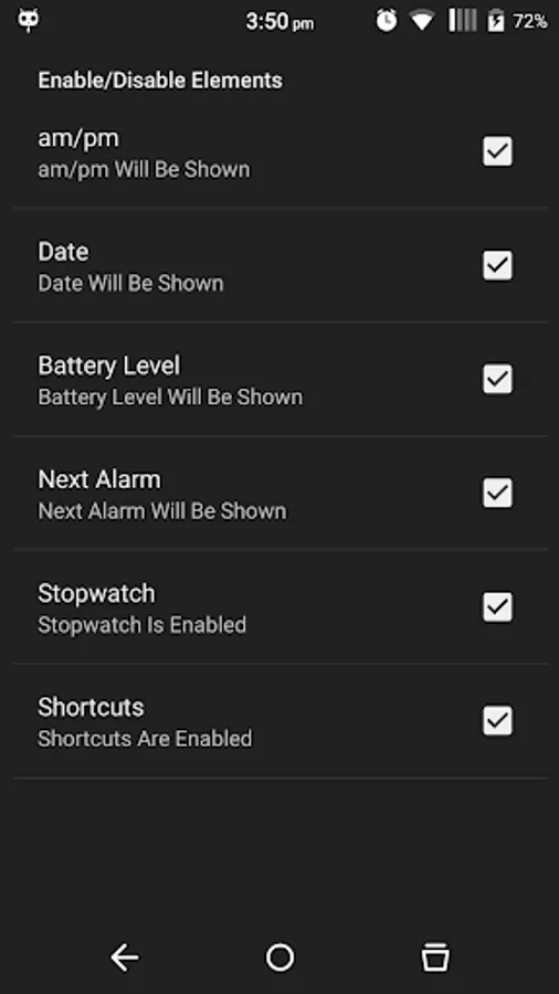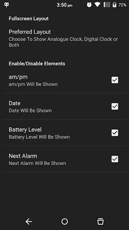 - Ability to disable am/pm, date, battery level and next alarm on the main screen and fullscreen