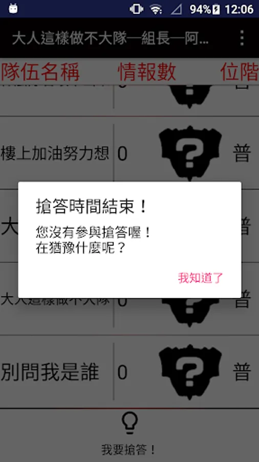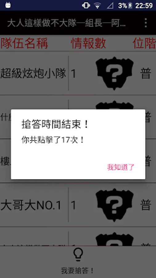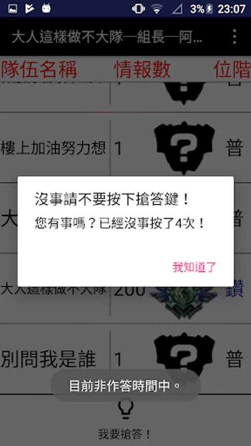 ※講師們發布可以搶答的時候,手機會開始震動,此時才可以按下「我要搶答」按鈕!若在非作答時間按下「我要搶答」多次就會出現對話框「沒事請不要按下搶答鍵!」