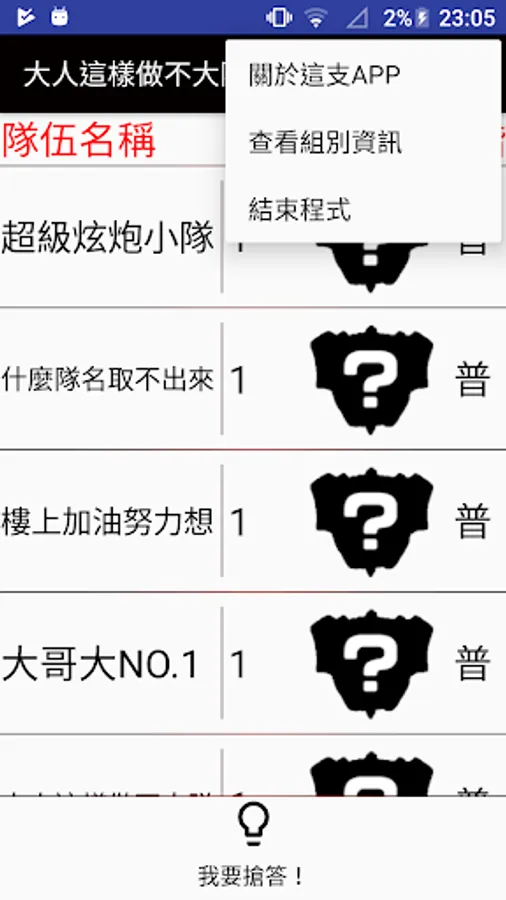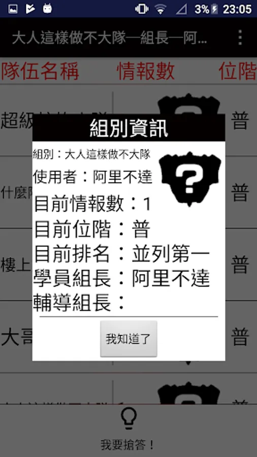 3.觀看組別資訊與排名─點擊右上角「┇」 圖示後即可出現選單,點擊「查看組別資訊後」即可出現組別資訊之對話框,此對話框將提供按下時間之小組資訊與排名。