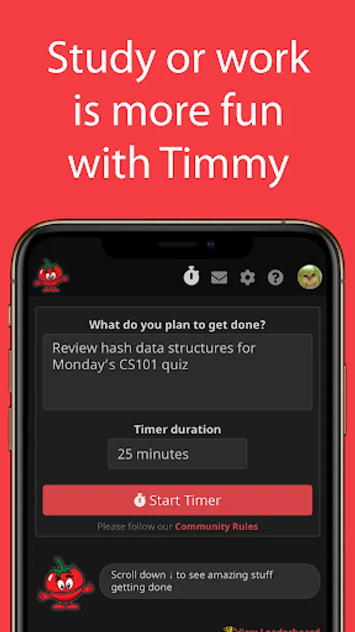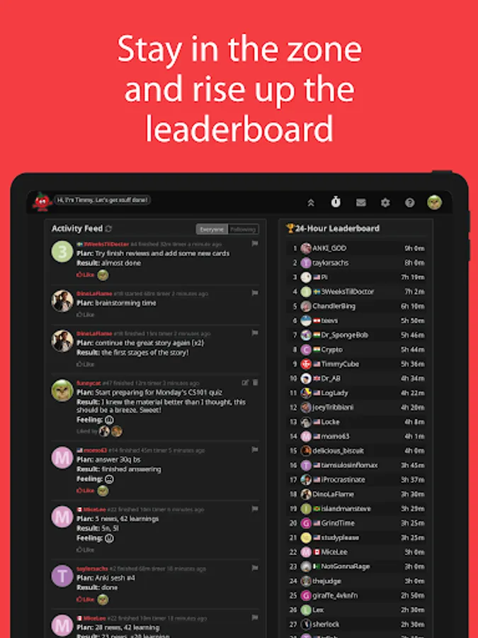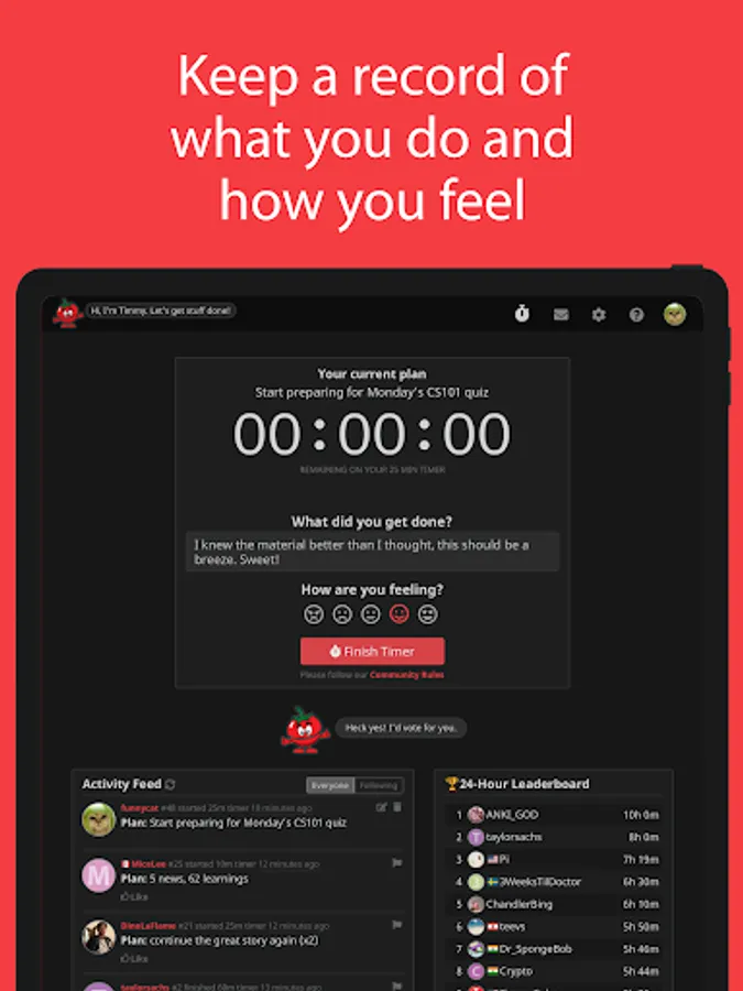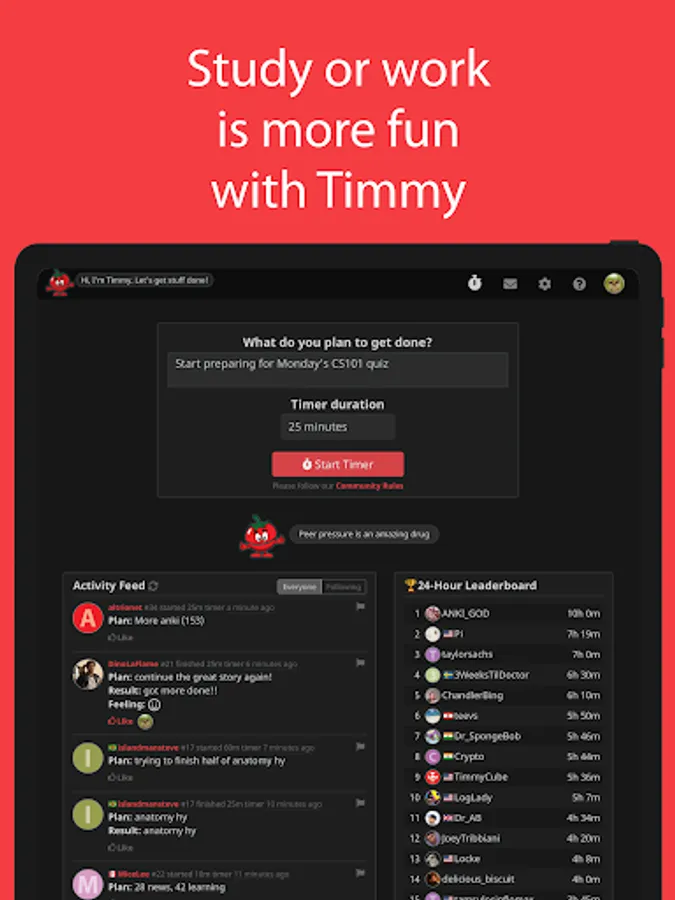 Timmy, a social network for students and knowledge workers, combines the proven Pomodoro technique with social accountability and a leaderboard to motivate you to get stuff done. Join our free and friendly community today!