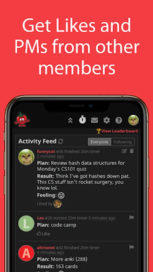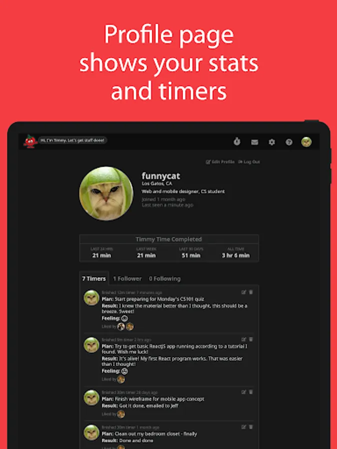 Since all timer notes are public, you can see a fascinating activity feed of every member's current timer notes. You can Like other timers, Follow other members, climb up the leaderboard, and send and receive private messages of support. The social accountability that results from making your goals and results public is a magically strong motivator.