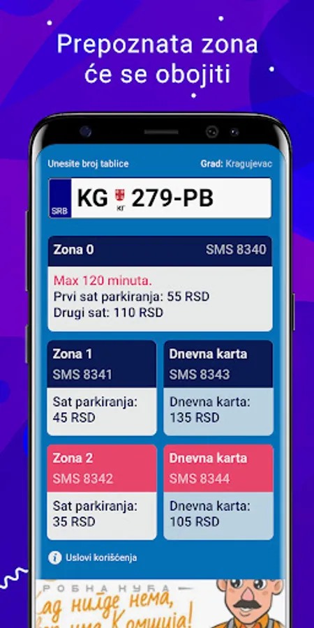 You never have to go back to the beginning of the street to check on the board which zone you are in. This application automatically does it for you. The application offers automatic recognition of the parking zone you are in and allows you to easily send an SMS to pay for parking. The cities of Kruševac, Šabac, Sremska Mitrovica, Zrenjanin, Leskovac, Subotica, Belgrade, Jagodina, Kragujevac, Niš, Novi Sad, Paraćin, Aranđelovac, Čačak, Sombor are covered. We work daily to add new cities.