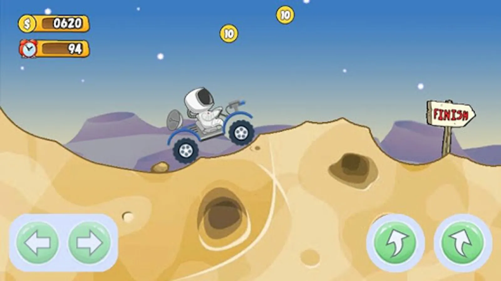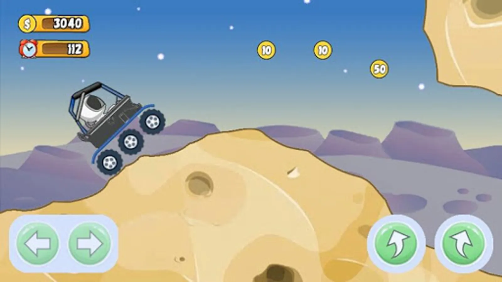 In this game you driving a lunar rover. You need to get to the finish line without breaking the lunar rover. Time for each level is limited.Overcome the craters and faults, climb the rocks and jump from the cliffs. Get bonuses for doing dangerous dizzying tricks.
