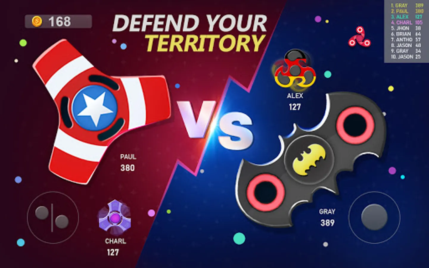 Play online in free-for-all action and use splitting, shrinking and dodging tactics to catch other players - or avoid bigger of them! Defend your territory and area against others spinners and become the biggest mass. Don't get hit and control your fidget spinner and fight with other spinners to stay longer! Survive long enough to become the biggest fidget spinner one in this game! Add your favorite Spinner!