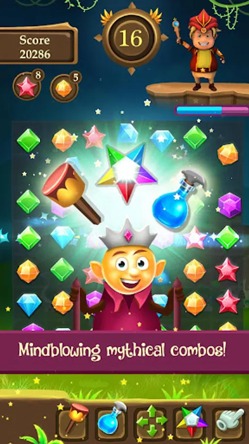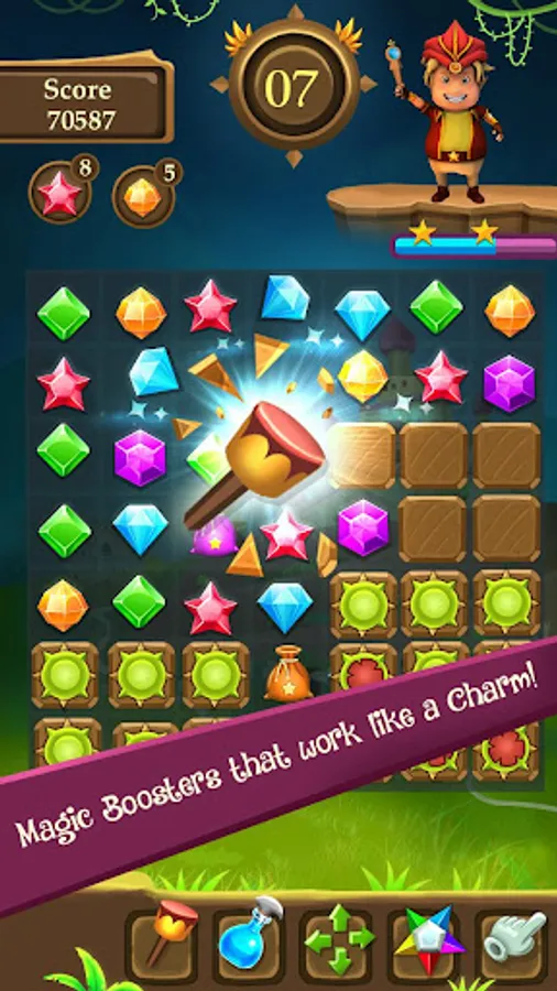 Match 3 or more jewels to crush them, or match 4+ gems to create powerful charms and rainbow blasts. Use magical spells and boosters to clear tough levels and keep progressing in this addictive jewel puzzle saga.