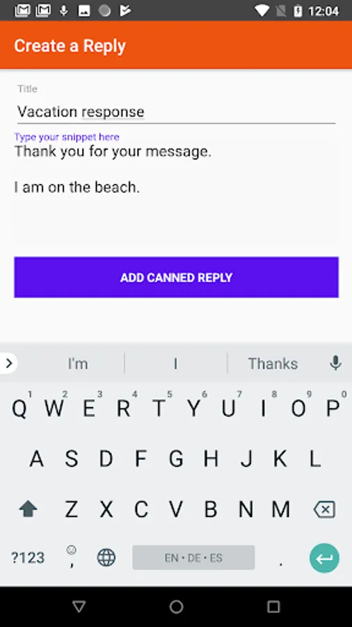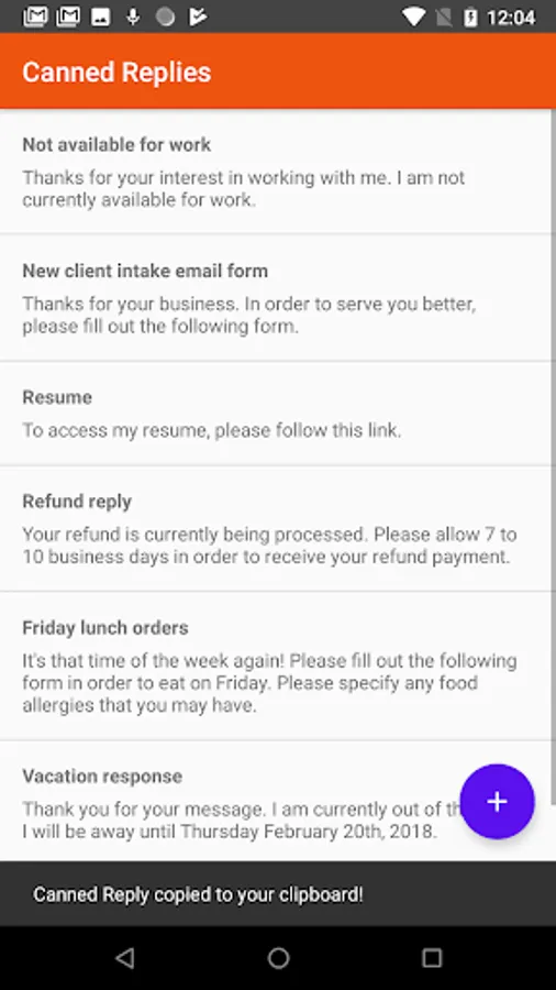 This app allows you to create, edit, and delete messages (canned replies) you send often. Add your messages ahead of time, then open the app to quickly copy to your clipboard with a single tap.