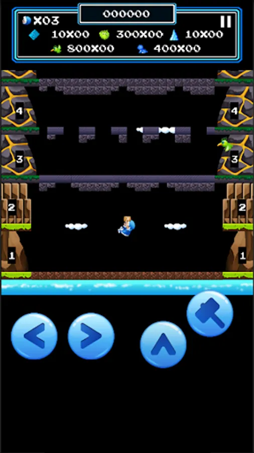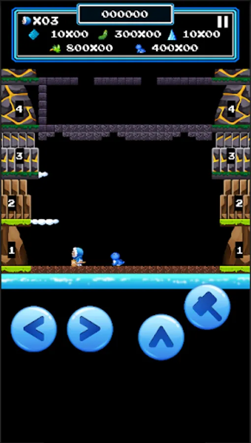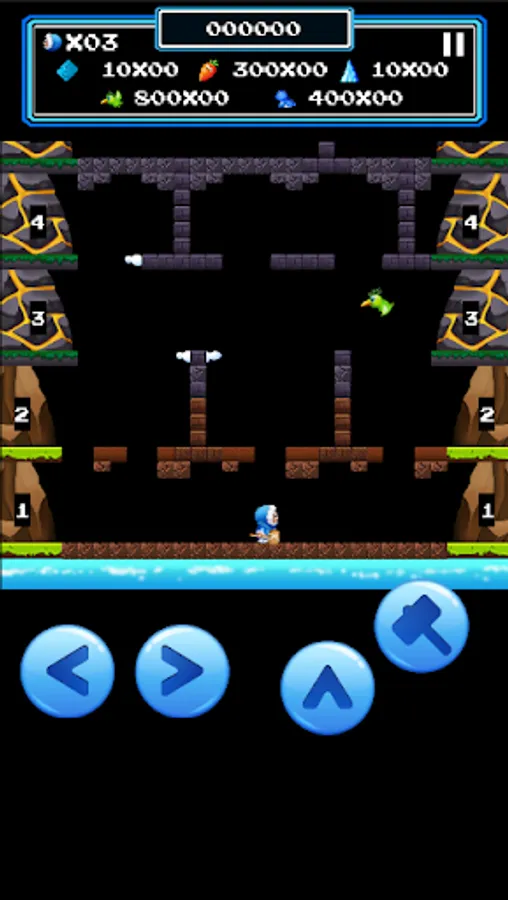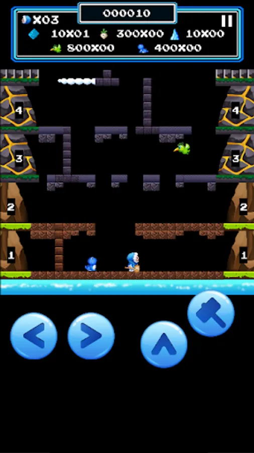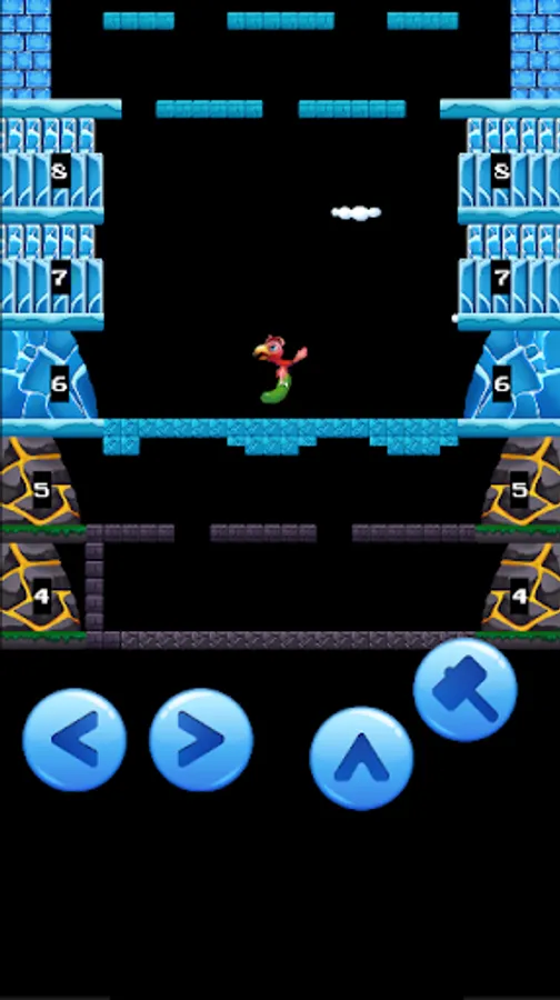 The player controls climber wearing a blue. The only tool they carry is a wooden mallet to carve openings in the ice above. Each mountain level consists of eight layers of colorful ice and a bonus stage. Standard, dull ice blocks pose no threat other than an easily disposed of barrier and platform. Square ice blocks with higher detail are indestructible, forcing the player to take another path. Hatched ice acts as a conveyor belt sliding the Eskimo either left or right. Finally, many mountains include unbreakable moving platforms resembling clouds. The bonus stage takes place at the peak. Within a 40 second time limit and no enemies, the Ice Climbers often face trickier jumps and multiple moving platforms. The peak is also the only place to recover stolen vegetables, most notably eggplants. Collecting just one piece of corn from the fifth bonus stage is the only way to gain an extra life. At the top of the peak, the Condor flies overhead.