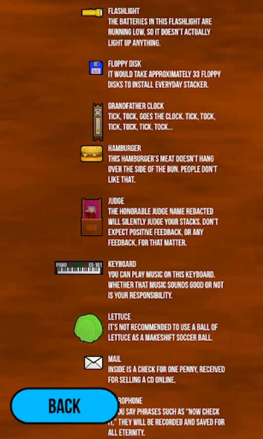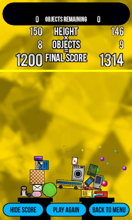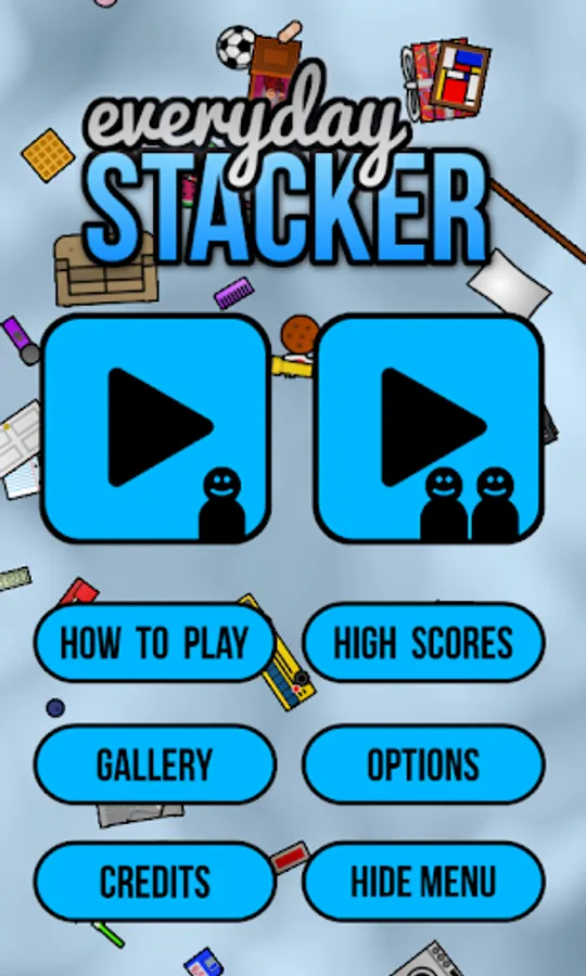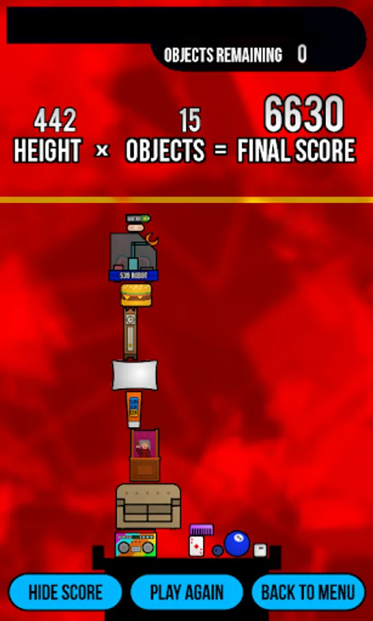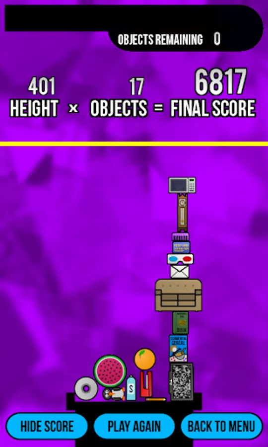 In Everyday Stacker, you take 65 everyday objects that you might find around the house, and stack them on top of each other to try and build the tallest tower possible. You only have three seconds to place each object where you want it, at which point the object will start falling and hopefully land on the tower. You have to be very careful as being slightly off center can cause the entire stack to topple over!