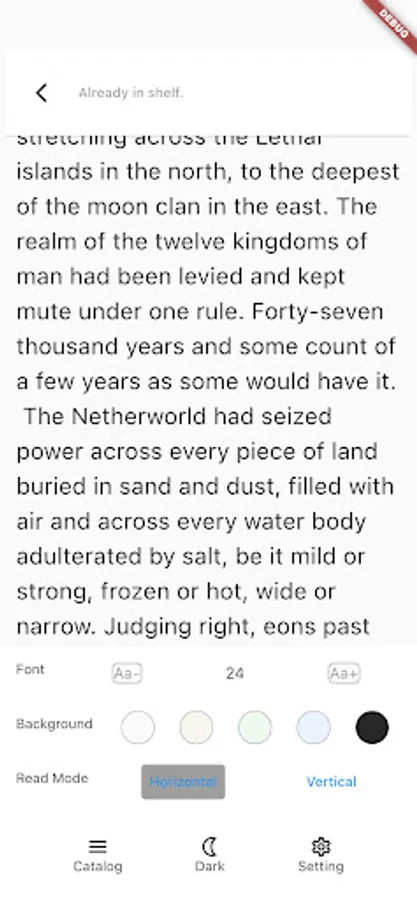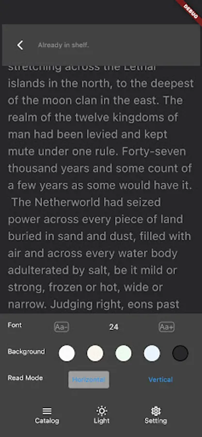 You can change the font size (only available for the epub format), move the brightness slider to adjust brightness, shift to Night Mode. Don't forget to turn on our new eye-care mode to reduce your eyestrain.