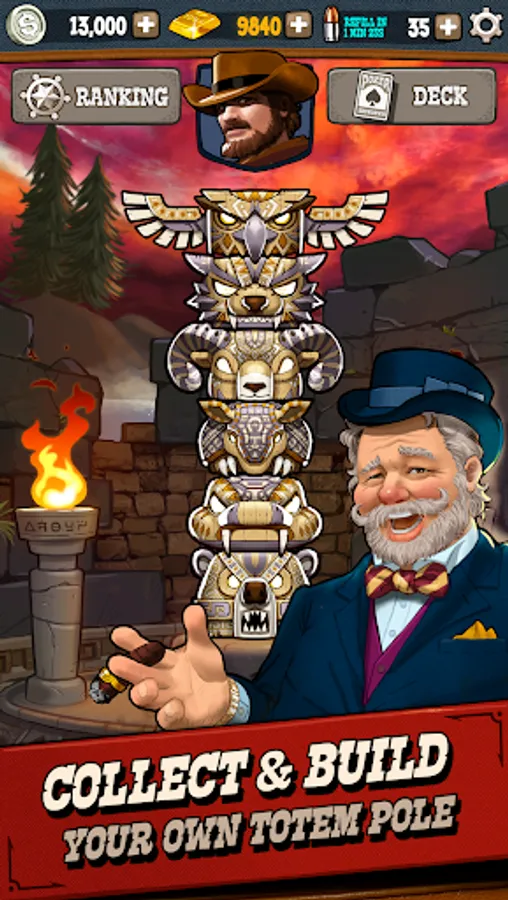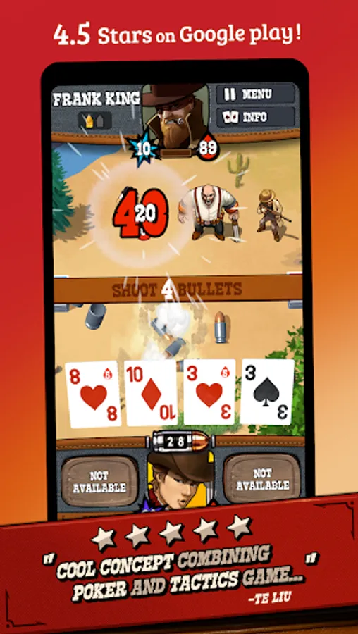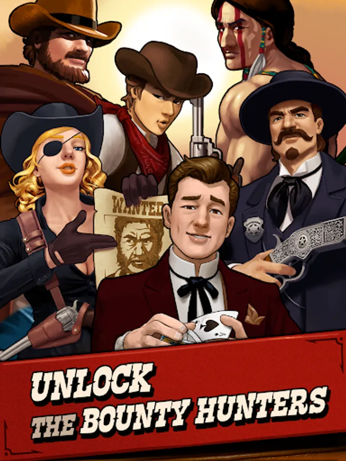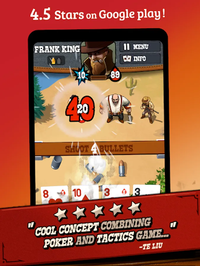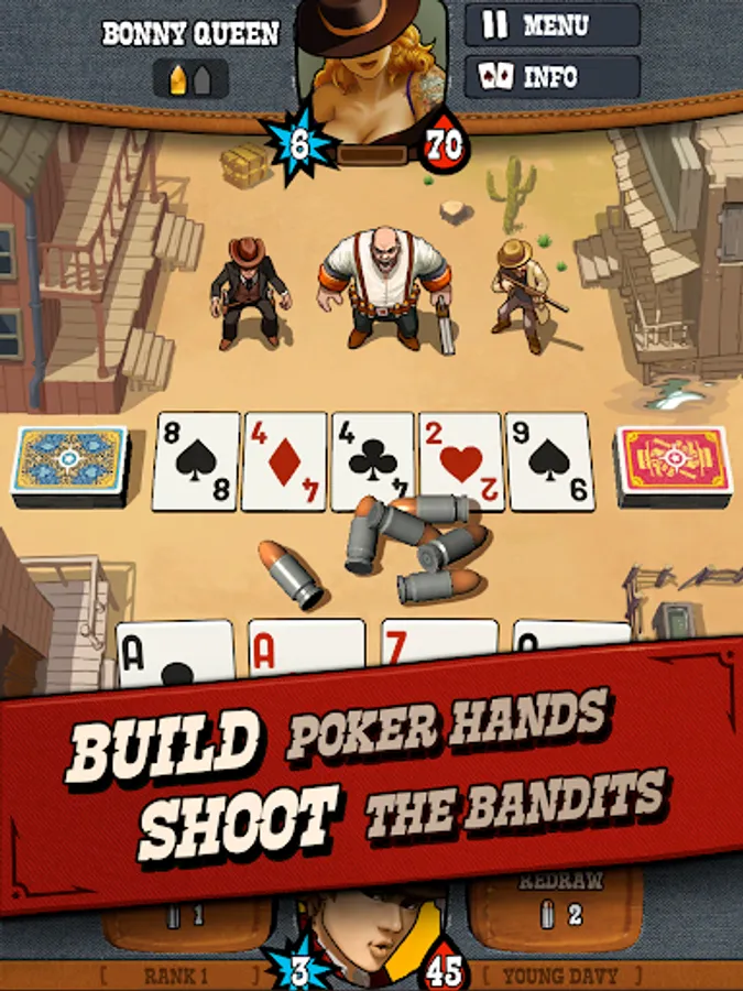 This game combines 5 card poker rules with turn based tactics rpg in a western setting to create a new game that involves building strong poker hands, cowboys with special abilities, collecting bounties, upgrading your card deck...